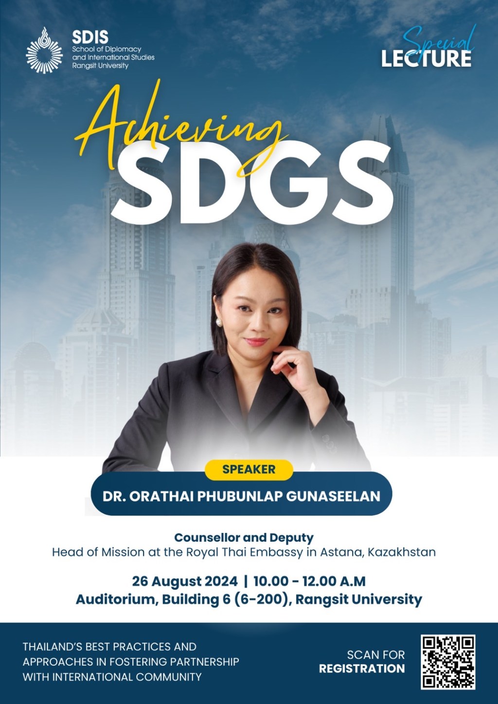 คณะการทูตและการต่างประเทศ มหาวิทยาลัยรังสิต จัดบรรยายพิเศษหัวข้อ “Achieve SDGs: Thailand’s Best Practices in Fostering Partnership with International Community” ในวันจันทร์ ที่ 26 สิงหาคม พ.ศ. 2567 เวลา 09.30 – 11.45 น. ณ ห้องออดิทอเรียม อาคาร Student Center (อาคาร 6) มหาวิทยาลัยรังสิต ภายในได้รับเกียรติจาก ดร. อรทัย ภูบุญลาบ กูนาซีลาน ที่ปรึกษาและรองหัวหน้าสํานักงาน สถานเอกอัครราชทูตไทย ประจํากรุงอัสตานา ประเทศคาซัคสถาน เป็นวิทยากร