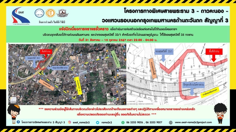 การทางพิเศษแห่งประเทศไทย (กทพ.) กระทรวงคมนาคมได้ว่าจ้าง กิจการร่วมค้า ไอทีดี-วีซีบี (ITD-VCB Joint Venture) ประกอบด้วย บริษัท อิตาเลียนไทย ดีเวล๊อปเมนต์ จำกัด (มหาชน) และบริษัท วิจิตรภัณฑ์ก่อสร้าง จำกัด เป็นผู้รับจ้างดําเนินการก่อสร้าง โครงการทางพิเศษสายพระราม3 – ดาวคะนอง – วงแหวนรอบนอกกรุงเทพมหานครด้านตะวันตกสัญญาที่ 3 แจ้งการปิดเบี่ยงการจราจรชั่วคราวบริเวณจุดกลับรถใต้ทางพิเศษเฉลิมมหานคร (ฝั่งขาออก) และปากซอยสุขสวัสดิ์33/1 เพื่อดำเนินการติดตั้งคานขวางของโครงการฯ ตั้งแต่วันที่ 31 สิงหาคม – 15 ตุลาคม 2567 เวลา 22.00 ถึง 04.00 น. สำหรับรถที่จะไปถนนราษฎร์บูรณะ ขอให้ไปใช้ซอยสุขสวัสดิ์ 35 ทดแทน