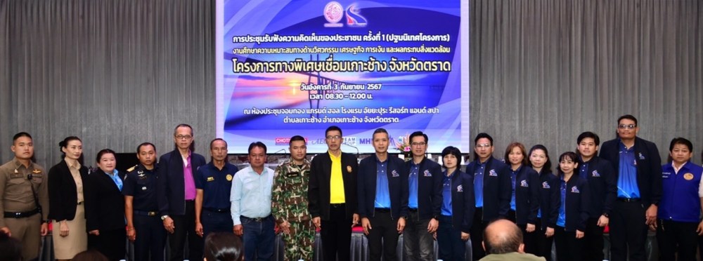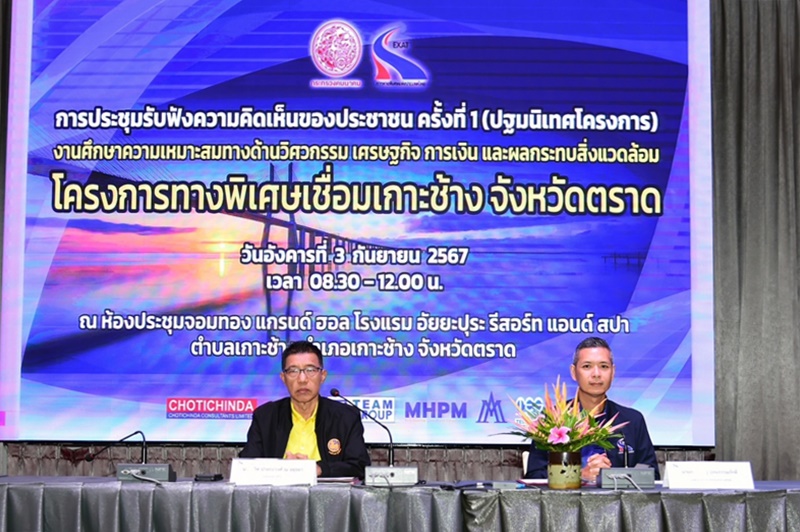 โดยมี นายกาจผจญ อุดมธรรมภักดี รองผู้ว่าการ กทพ. และนายนริศ ปาลกะวงศ์ ณ อยุธยา นายอำเภอเกาะช้าง เป็นประธานเปิด การประชุมฯ เพื่อประชาสัมพันธ์และเผยแพร่ข้อมูลโครงการ ได้แก่ ความเป็นมา วัตถุประสงค์ พื้นที่ศึกษา ขอบเขตการดำเนินงาน แผนดำเนินงาน และแนวคิดการพัฒนาของโครงการ เพื่อให้ทุกภาคส่วนที่เกี่ยวข้องทั้งผู้แทนหน่วยงานของรัฐ ภาคเอกชน สถาบันการศึกษา ภาควิชาการ องค์กรปกครองส่วนท้องถิ่น ผู้นำชุมชน ภาคประชาสังคม สื่อมวลชน และผู้สนใจ ได้มีโอกาสร่วมรับรู้ข้อมูลโครงการตั้งแต่ต้น และได้มีส่วนร่วมในการให้ข้อคิดเห็นและข้อเสนอแนะสำหรับนำไปประกอบการดำเนินงานศึกษาต่อไป ซึ่งจะเป็นประโยชน์สูงสุดต่อการดำเนินงานศึกษาความเหมาะสมฯ