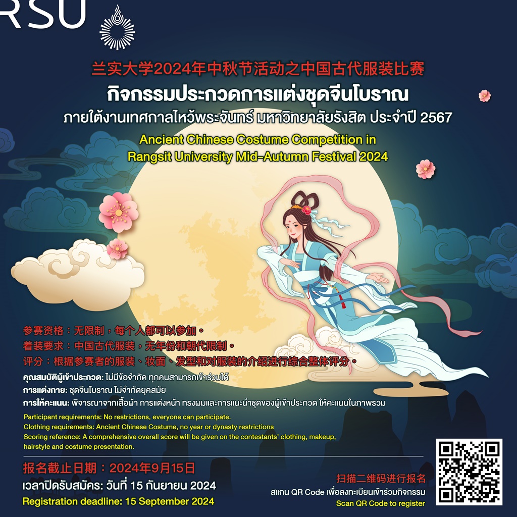 สถาบันจีน-ไทยแห่งมหาวิทยาลัยรังสิต ขอเชิญผู้ที่สนใจเข้าร่วมการประกวดการแต่งกายชุดจีนโบราณ ในงานไหว้พระจันทร์ ประจำปี 2567 ซึ่งจะจัดขึ้นระหว่างวันที่ 16 – 18 กันยายน 2567 เวลา 16.30 น. – 20.00 น. ณ อาคารอาทิตย์ อุไรรัตน์ (อาคาร 1) มหาวิทยาลัยรังสิต ผู้ที่สนใจสามารถสมัครเข้าร่วมการประกวดได้ตั้งแต่วันนี้ – 15 กันยายน 2567 โดยสามารถเข้าร่วมการประกวดได้ทุกเพศ ทุกวัย ไม่มีข้อจำกัด พร้อมการแต่งกายชุดจีนโบราณ ไม่จำกัดยุคสมัย ทั้งนี้ สามารถสแกน QR CODE เพื่อลงทะเบียนเข้าร่วมกิจกรรม หรือสามารถสอบถามรายละเอียดเพิ่มเติมได้ที่ สถาบันจีน-ไทยแห่งมหาวิทยาลัยรังสิต โทร. 0-2997-2200 ต่อ 6515