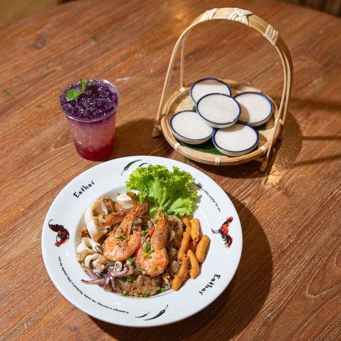 สัมผัสรสชาติไทยที่แตกต่าง ด้วยเมนูหลากหลายสไตล์ที่ Eathai ชั้น LGลิ้มลองชุดขนมไทย ‘Baan Khanom Thai Set’ (160 บาท) ที่พาคุณสัมผัสเสน่ห์ไทย..จากอดีตสู่ปัจจุบัน ที่รวบรวมขนมถ้วยสูตรโบราณ พร้อมเครื่องดื่มร่วมสมัยที่ผสานรสชาติของพีชหอมหวาน และสตรอว์เบอร์รี่สดชื่น รสเปรี้ยวอมหวานที่ลงตัว ชื่นใจคลายร้อน พร้อมอร่อยเต็มคำกับอาหารจานหลัก‘Stir-Fried Rice Noodles with Seafood and Egg’ (195 บาท) ก๋วยเตี๋ยวคั่วทะเลสูตรเฉพาะที่หอมกลิ่นกระทะ อัดแน่นด้วยปลาหมึกและกุ้งเนื้อเด้งที่เคี้ยวเพลิน อร่อยฟินจนต้องยกนิ้ว