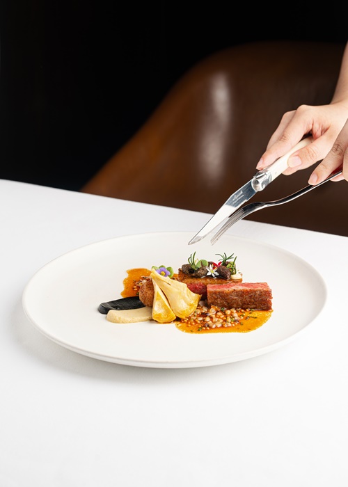 ดื่มด่ำกับประสบการณ์รสชาติพิเศษจาก The Water Library ชั้น 5 กับเมนูพิเศษที่คุณจะหลงรัก ‘A4 Striploin’ เนื้อวากิว A4 สันนอกคุณภาพเยี่ยมจากญี่ปุ่นที่เชฟนำไปเคลือบด้วยแยมเลมอนและวานิลลาย่างจนหอมกรุ่นนุ่มละมุนทุกคำ เสิร์ฟพร้อมมันฝรั่งกงฟีที่เนียนนุ่ม และอาร์ติโชคสไตล์ฝรั่งเศสที่หอมละมุนด้วยกลิ่นโรสแมรี เพิ่มความพิเศษด้วยรสเปรี้ยวเล็กน้อยของมะกอก และความกลมกล่อมของซอสเนื้อและซอสกระเทียมดำที่ลงตัวทุกคำ