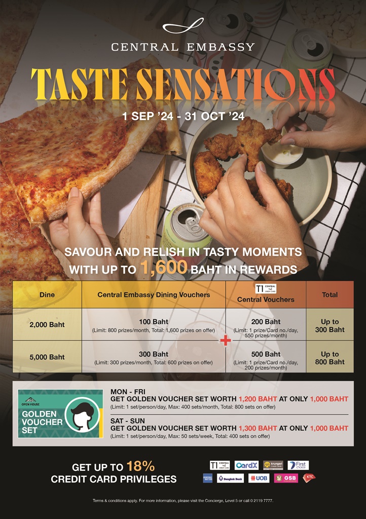 ยิ่งกิน ยิ่งคุ้ม! รับฟรี Central Embassy Dining Voucher และ Central Voucher จากบัตรเครดิต เซ็นทรัล เดอะวัน รวมมูลค่าสูงสุด 1,600 บาท เมื่อมียอดรับประทานอาหารครบตามเงื่อนไข (จำกัด 2,200 รางวัลตลอดรายการ) โดยรางวัลแบ่งเป็น 2 รอบ ได้แก่ รอบที่ 1 วันที่ 1 ก.ย. 67 – 30 ก.ย. 67 และ รอบที่ 2 วันที่1 ต.ค. 67 – 31 ต.ค. 67 อาทิ รับรวมสูงสุด 300 บาท เมื่ออิ่มครบ 2,000 บาท ต่อวัน (Central Embassy Dining Voucher มูลค่า 100 บาท จำกัด 800 รางวัล ต่อรอบ และ Central Voucher จากบัตรเครดิตเซ็นทรัล เดอะวัน มูลค่า 200 บาท จำกัด 1 สิทธิ์ ต่อหมายเลขบัตร ต่อวัน และ 550 สิทธิ์ ต่อเดือน) หรือ รับรวมสูงสุด 800 บาท เมื่ออิ่มครบ 5,000 บาท ต่อวัน (Central Embassy Dining Voucher มูลค่า 300 บาท จำกัด 300 รางวัล ต่อรอบ และ Central Voucher จากบัตรเครดิตเซ็นทรัล เดอะวัน มูลค่า 500 บาท จำกัด 1 สิทธิ์ ต่อหมายเลขบัตร ต่อวัน และ 200 สิทธิ์ต่อเดือน) พร้อมรับสิทธิพิเศษจากบัตรเครดิตที่ร่วมรายการสูงสุด 18% เมื่ออิ่มครบตามเงื่อนไข