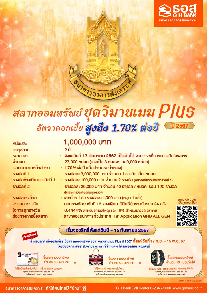 ธนาคารอาคารสงเคราะห์ (ธอส.) เปิดจำหน่ายสลากออมทรัพย์ ธอส. ชุดวิมานเมฆ Plus ปี 2567 อายุสลาก 2 ปี ผลตอบแทนหน้าสลากสูงถึง 1.70% ต่อปี ลุ้นรับเงินรางวัลมูลค่า 3 ล้านบาท ตลอด 24 งวด ผู้ที่สนใจสามารถซื้อสลากผ่านช่องทาง Mobile Application : GHB ALL GEN และ ธอส. ทุกสาขาทั่วประเทศ ตั้งแต่วันที่ 17 กันยายน 2567 และออกรางวัลครั้งแรก วันที่ 16 ตุลาคม 2567