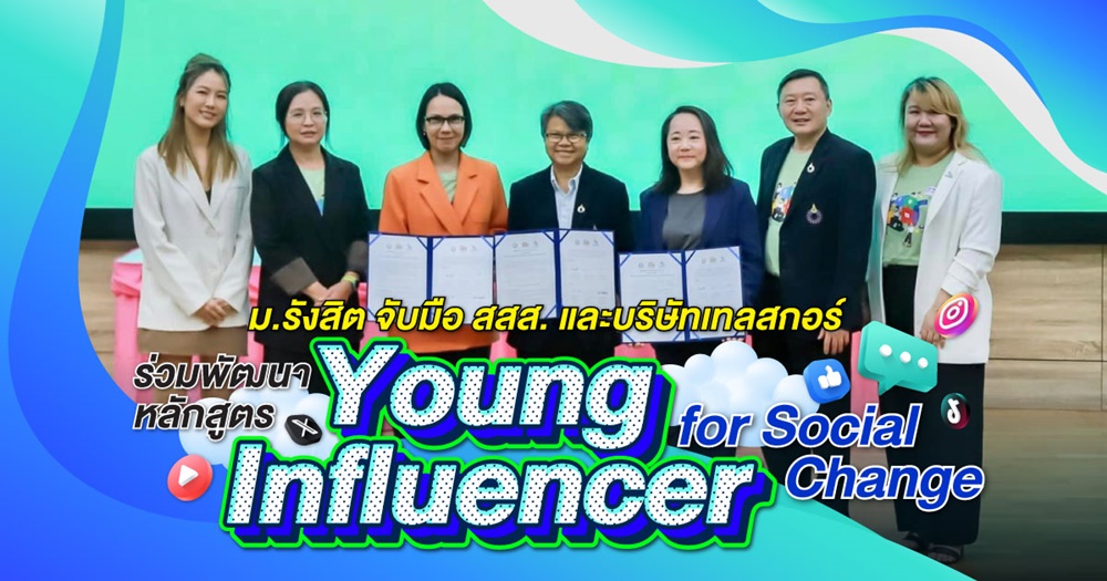 วิทยาลัยนวัตกรรมดิจิทัลเทคโนโลยี มหาวิทยาลัยรังสิต ร่วมกับ สำนักงานกองทุนสนับสนุนการสร้างเสริมสุขภาพ (สสส.) และบริษัท เทลสกอร์ จำกัด จัดพิธีลงนามบันทึกข้อตกลงความร่วมมือทางวิชาการ (MOU) เดินหน้าพัฒนาหลักสูตรวิชาอินฟลูเอนเซอร์เพื่อเปลี่ยนแปลงสังคม ผ่านการอบรมภายใต้โครงการ Young Influencer for Social Change หวังให้เยาวชนคนรุ่นใหม่ตื่นตัวใช้พลังโซเชียลขับเคลื่อนสังคมสุขภาวะ