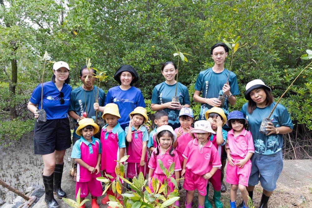 บมจ.กรุงไทย-แอกซ่า ประกันชีวิต ในฐานะผู้นำบริษัทฯ ที่ใส่ใจสิ่งแวดล้อม หรือ Green Insurer ร่วมกับมูลนิธิ ลากูน่า ภูเก็ต และศูนย์วิจัยทรัพยากรทะเลและชายฝั่งทะเลอันดามันตอนบน นำโดย คุณสุกัญญา อิสรานุวัฒน์ชัย รองประธานอาวุโส ฝ่ายสื่อสารการตลาดและภาพลักษณ์องค์กร (คนที่ 3 จากซ้าย) คุณอังคณา โตสิลานนท์ รองประธาน ฝ่ายทรัพยากรบุคคล (คนที่ 3 จากขวา) พนักงานจิตอาสากรุงไทย-แอกซ่า ประกันชีวิต และเครือลากูน่า นักเรียนจากโรงเรียนมูลนธิลากูน่า ภูเก็ต พร้อมทั้งชาวบ้านคลองเคียง ร่วมกันปลูกป่าชายเลนปีที่ 2 ภายใต้โครงการ Save Our Sea จำนวน 1,200 ต้น ซึ่งสามารถดูดซับก๊าซคาร์บอนได้ออกไซด์ ได้มากถึง 32 ตันต่อปี ณ โรงเรียนคลองเคียนรัฐราษฏร์รังสรรค์ จ.พังงา