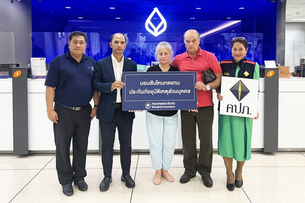 บริษัท กรุงเทพประกันภัย จำกัด (มหาชน) โดยนายศักดิ์สิทธิ์ เหมือนพรรณราย (ที่ 2 จากซ้าย) ผู้จัดการสาขาภูเก็ต เป็นผู้แทนบริษัทฯ มอบสินไหมทดแทนประกันภัยอุบัติเหตุส่วนบุคคล โครงการบัตรบีเฟิสต์ สมาร์ท แรบบิท ศิริราช ให้แก่ Mr. Aleksandr Baturin (ที่ 2 จากขวา) ซึ่งเป็นบิดาของผู้เอาประกันภัยและผู้รับประโยชน์ เป็นจำนวนเงิน 120,647.10 บาท จากกรณี Mr. Evgeni Baturin ผู้เอาประกันภัยเสียชีวิตจากอุบัติเหตุดินโคลนถล่ม โดยมี Mrs. Svetlana Baturin (กลาง) มารดาของผู้เอาประกันภัย นางสาวนฏกร เดชนุ่น (ขวาสุด) นักวิชาการประกันภัย สนง. คปภ. จังหวัดภูเก็ต และนายสัญญา ภู่เจริญ (ซ้ายสุด) ผู้จัดการธนาคารกรุงเทพ สาขากะรน ร่วมมอบสินไหมทดแทนและเป็นสักขีพยาน ณ ธนาคารกรุงเทพ สาขาถนนเทพกษัตรีย์ จ. ภูเก็ต เมื่อเร็วๆ นี้