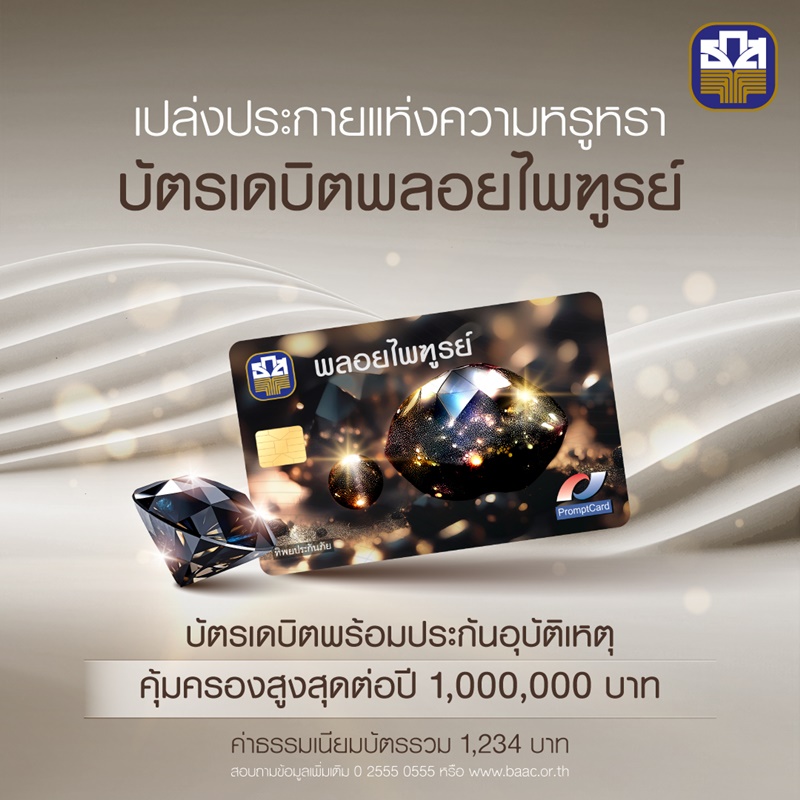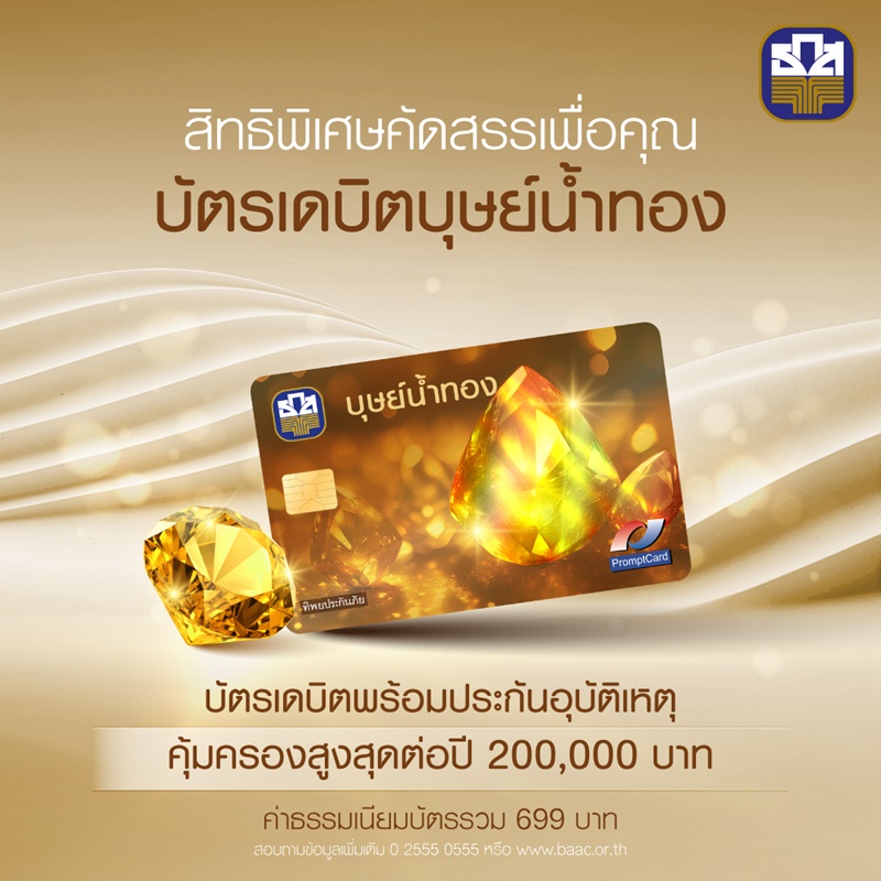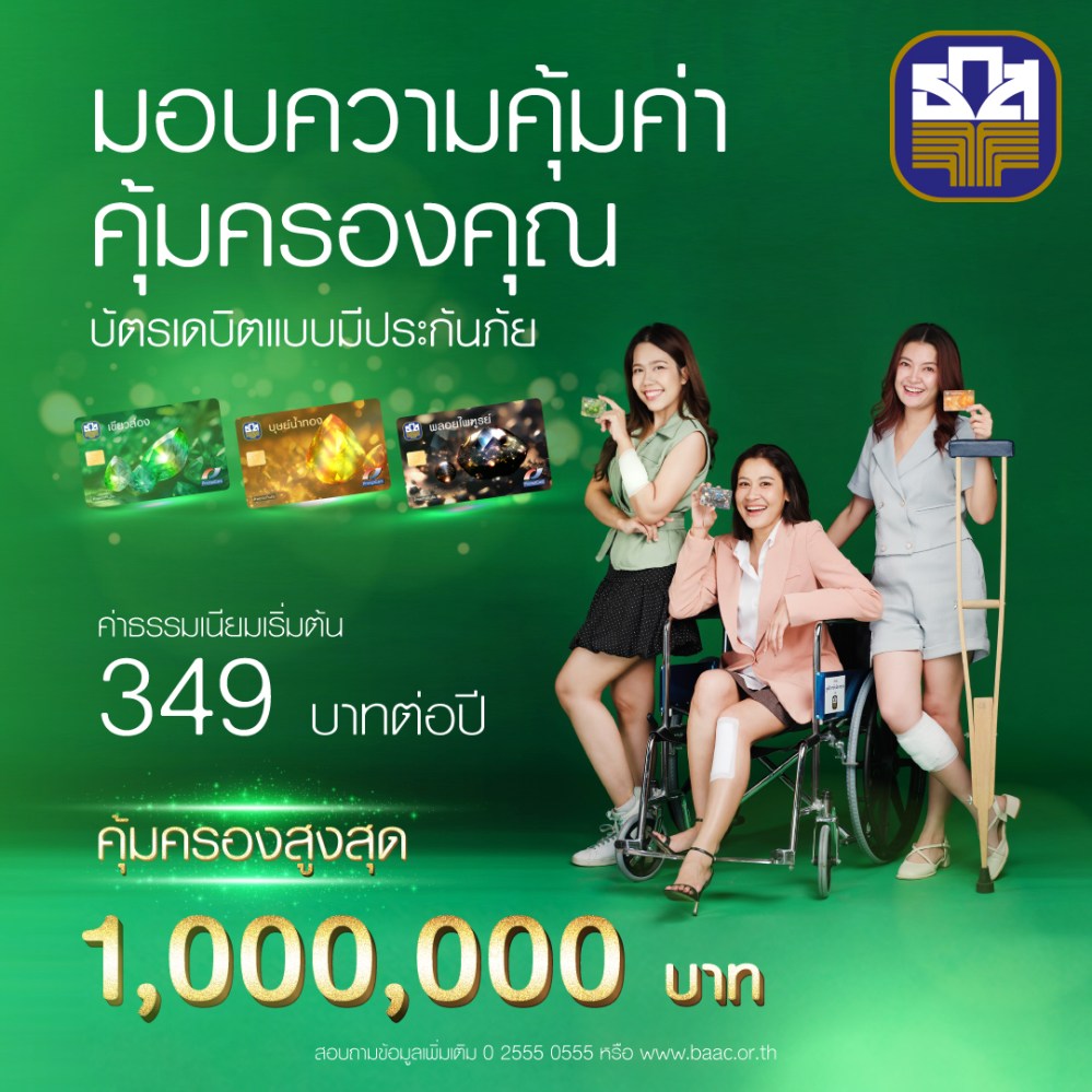 ธ.ก.ส. เปิดตัวบัตรเดบิตใหม่ 3 สไตล์ ทั้งเขียวส่อง บุษย์น้ำทอง และพลอยไพฑูรย์ มอบความพิเศษด้วยประกันอุบัติเหตุ วงเงินสูงสุดถึง 1 ล้านบาท ที่คุ้มครองคุณทุกที่ ทุกเวลา ไม่ว่าใครก็สบายใจ พร้อมบริการถอน โอน จ่ายบิลและซื้อของที่สะดวกสบาย ปลอดภัยและรองรับการชำระเงินแบบ Contactless แค่แตะก็จ่ายได้เลย พิเศษ! สมัครบัตรใหม่พร้อมค่าธรรมเนียม เริ่มต้นเพียง 349 บาทต่อปี รับคะแนน A-Rewards เท่ากับค่าธรรมเนียม ตั้งแต่วันนี้จนถึง 31 ธ.ค. นี้ สมัครได้ที่ ธ.ก.ส. ทุกสาขาทั่วประเทศ