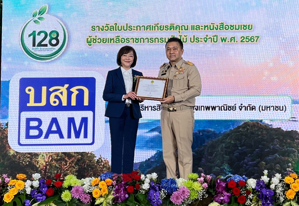 นางวิภาศิริ แสงวัชระกูล ผู้ช่วยประธานเจ้าหน้าที่บริหาร บริษัทบริหารสินทรัพย์ กรุงเทพพาณิชย์ จำกัด (มหาชน) หรือ BAM เข้าร่วมพิธีวันสถาปนากรมป่าไม้ ครบรอบ 128 ปี พร้อมรับรางวัลหนังสือชมเชยแก่ผู้ช่วยเหลือราชการกรมป่าไม้ สาขาส่งเสริมและพัฒนาป่าชุมชน ในการเป็นผู้สนับสนุนภารกิจ งานด้านป่าชุมชนของกรมป่าไม้ จากนายบรรณรักษ์ เสริมทอง รองอธิบดีกรมป่าไม้ เมื่อวันที่ 18 กันยายม 2567