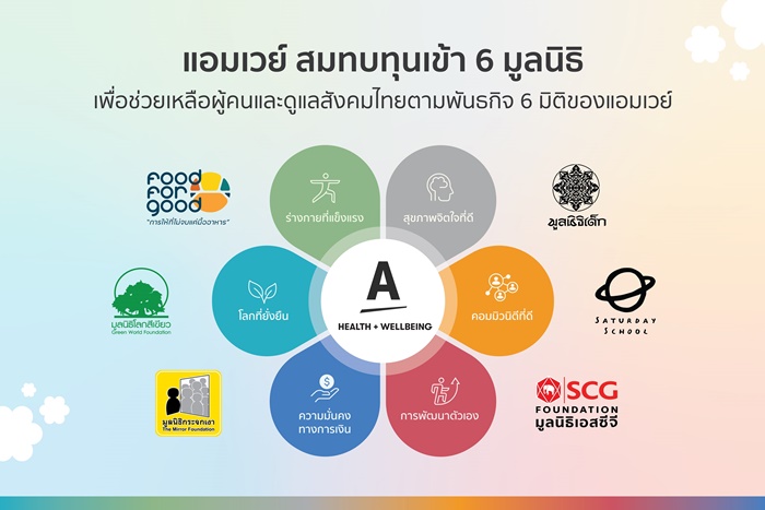 นอกจากนี้ แอมเวย์ ยังตั้งใจเป็นอีกหนึ่งฟันเฟืองในการมอบโอกาสและความช่วยเหลือไปสู่ผู้คนในสังคมไทยให้มีสุขภาพและสุขภาวะที่ดี โดยจะมอบเงินสมทบทุนเข้า 6 มูลนิธิ ที่มีพันธกิจในการช่วยเหลือผู้คนและดูแลสังคมไทย ใน 6 มิติ ซึ่งเป็นแนวทางเดียวกับพันธกิจของแอมเวย์ ได้แก่ การเสริมสร้างร่างกายที่แข็งแรง การส่งเสริมสุขภาพจิตใจที่ดี การมีคอมมิวนิตีที่ดี การพัฒนาตัวเอง การสร้างความมั่นคงทางการเงิน และการสนับสนุนเพื่อโลกที่ยั่งยืนผ่าน 6 มูลนิธิ ประกอบด้วย