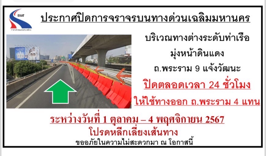 การทางพิเศษแห่งประเทศไทย (กทพ.) กระทรวงคมนาคม ได้ว่าจ้าง บริษัท เวิร์ล บริดจ์ เทคโนโลยี จำกัด เป็นผู้รับจ้างดำเนินการก่อสร้าง งานปรับปรุงรอยต่อผิวจราจรบนทางพิเศษเฉลิมมหานคร (Site 3 และทางขึ้น-ลงเพชรบุรีคลองตัน) และทางพิเศษฉลองรัช บริเวณ กม.22+100 ทิศทางจตุโชติ-รามอินทรา ซึ่งมีความจำเป็นจะต้องปิดการจราจรบริเวณทางต่างระดับท่าเรือ มุ่งหน้าดินแดง ถ.พระราม 9 แจ้งวัฒนะ ระหว่าง วันที่ 1 ตุลาคม 2567 ถึงวันที่ 4 พฤศจิกายน 2567 ตลอดเวลา 24 ชั่วโมง โดยผู้ที่จะต้องใช้เส้นทางดังกล่าว ให้ใช้ทางออกถนนพระราม 4 เป็นการทดแทน