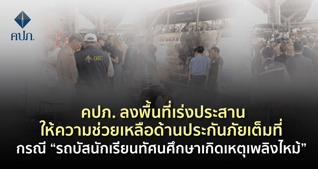 วันนี้ (1 ตุลาคม 2567) สำนักงานคณะกรรมการกำกับและส่งเสริมการประกอบธุรกิจประกันภัย (สำนักงาน คปภ.) โดยสายคุ้มครองสิทธิประโยชน์ สายส่งเสริมและประกันภัยภูมิภาค สำนักงาน คปภ. ภาค 6 (ชลบุรี) และสำนักงาน คปภ. จังหวัดปทุมธานี ลงพื้นที่ทันทีหลังเกิดเหตุ รถบัส หมายเลขทะเบียน 30-0423 สิงห์บุรี นำเด็กนักเรียนโรงเรียนวัดเขาพระยาสังฆาราม จังหวัดอุทัยธานี เดินทางมาทัศนศึกษาในพื้นที่จังหวัดนนทบุรี เกิดอุบัติเหตุเฉี่ยวชนแบริเออร์เกาะกลางถนน ส่งผลให้รถบัสเกิดเพลิงไหม้บนถนนวิภาวดีรังสิต ตำบลคูคต อำเภอลำลูกกา จังหวัดปทุมธานี โดยเบื้องต้นพบว่า มีผู้โดยสารทั้งหมด 44 คน นักเรียนและครูเสียชีวิต 23 ราย และบาดเจ็บ 5 ราย พร้อมทั้งตรวจสอบข้อมูลการทำประกันภัย และติดตามรายงานความเสียหายอย่างเร่งด่วนผ่าน Platform การรายงานข้อมูลกรณีอุบัติภัยกลุ่มหรือรายใหญ่ด้วยระบบอิเล็กทรอนิกส์ รวมทั้งลงพื้นที่เพื่ออำนวยความสะดวกด้านประกันภัยให้กับครอบครัวของผู้ประสบภัยอย่างเต็มที่ เพื่อให้ระบบประกันภัยช่วยบรรเทาความเดือดร้อนให้กับครอบครัวของผู้เสียชีวิตและบาดเจ็บได้อย่างมีประสิทธิภาพและเป็นธรรม