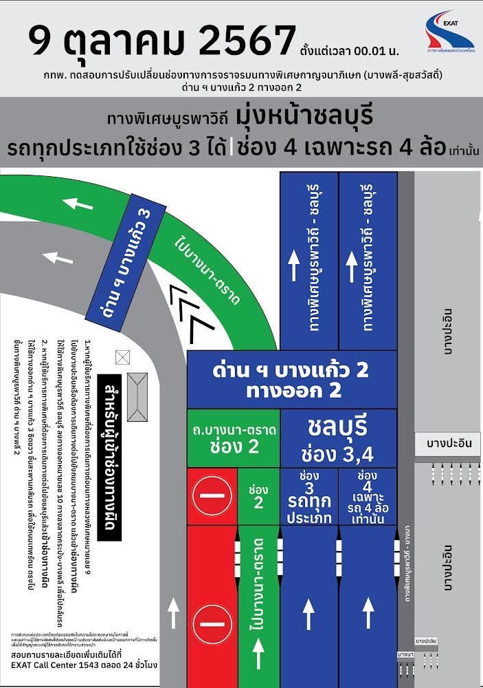 การทางพิเศษแห่งประเทศไทย (กทพ.) กระทรวงคมนาคม จะทดสอบการปรับเปลี่ยนช่องทางการจราจร บนทางพิเศษกาญจนาภิเษก (บางพลี-สุขสวัสดิ์) ทิศทางจากพระราม 2 มุ่งหน้าไปทางพิเศษบูรพาวิถี บางนา ชลบุรี เพื่อลดการตัดกระแสการจราจรบริเวณหน้า – หลัง ด่าน ฯ บางแก้ว 2 ทางออก 2 โดยช่องทางที่ 3 จะใช้สำหรับรถทุกประเภท และช่องทางที่ 4 เฉพาะรถ 4 ล้อเท่านั้น เริ่มตั้งแต่วันที่ 9 ตุลาคม 2567 เวลา 0.01 น. เป็นต้นไป