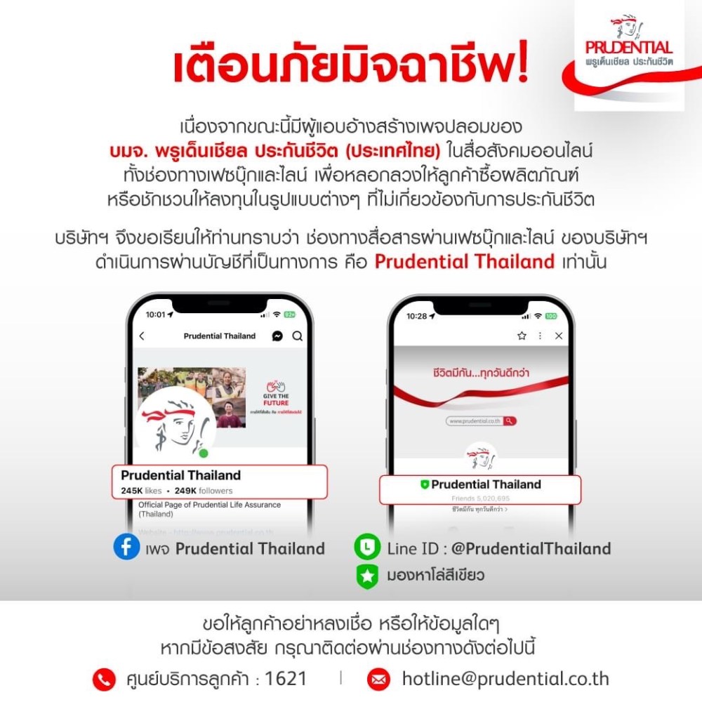 บริษัทฯ จึงขอเรียนให้ท่านทราบว่า ช่องทางสื่อสารผ่านเฟซบุ๊ก และไลน์ ของบริษัทฯ ดำเนินการผ่านบัญชีที่เป็นทางการ คือ Prudential Thailand เท่านั้น