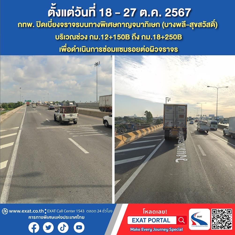การทางพิเศษแห่งประเทศไทย (กทพ.) กระทรวงคมนาคม ได้ว่าจ้างกิจการร่วมค้า DW ให้ดำเนินการซ่อมแซมรอยต่อผิวจราจรบนทางพิเศษกาญจนาภิเษก (บางพลี – สุขสวัสดิ์) บริเวณช่วง กม.12+150B ถึง กม.18+250B ทิศทางสุขสวัสดิ์ – บางพลี จึงมีความจำเป็นจะต้องปิดและเบี่ยงจราจร ตั้งแต่วันที่ 18 ตุลาคม 2567 เวลา 22.00 น. – วันที่ 27 ตุลาคม 2567 เวลา 04.00 น. ตลอด 24 ชั่วโมง โดยมีรายละเอียดดังนี้