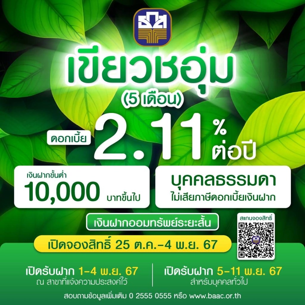 นายฉัตรชัย ศิริไล ผู้จัดการธนาคารเพื่อการเกษตรและสหกรณ์การเกษตร (ธ.ก.ส.) กล่าวว่า เพื่อเป็น การส่งเสริมการออมให้แก่ประชาชนและพี่น้องเกษตรกรในโอกาสครบรอบวันสถาปนา ธ.ก.ส. ปีที่ 59 ในวันที่ 1 พฤศจิกายน 2567 ธ.ก.ส. จึงได้จัดทำผลิตภัณฑ์ “เงินฝากเขียวชอุ่ม” โครงการเงินฝากออมทรัพย์พิเศษระยะสั้น รับฝากรวม 10,000 ล้านบาท ที่ให้ผลตอบแทนเป็นอัตราดอกเบี้ยสูงถึงร้อยละ 2.11 ต่อปี ระยะเวลาฝาก 5 เดือน (นับจากวันรับฝากแบบวันชนวัน) ฝากขั้นต่ำครั้งละ 10,000 บาท สูงสุดไม่เกิน 100 ล้านบาทต่อบัญชี โดยบุคคลธรรมดาไม่เสียภาษีจากดอกเบี้ยเงินฝากเขียวชอุ่ม และกรณีผู้ฝากถอนเงินบางส่วนหรือปิดบัญชีก่อนกำหนด ธนาคารจะจ่ายดอกเบี้ยตามเงื่อนไขที่ธนาคารกำหนด