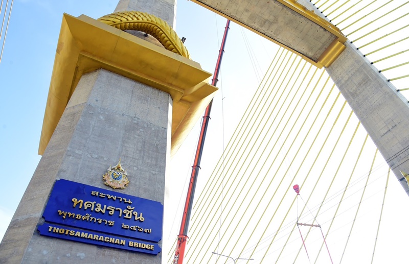 1. แผ่นป้ายชื่อสะพานทศมราชัน จำนวน 2 ป้าย โดยมีตำแหน่งติดตั้งบริเวณใต้ฐานพญานาค ของเสา (Pylon)(ฝั่งกรุงเทพมหานคร – ขาออก) (ด้านซ้ายมือหันหน้าเข้าสู่ผู้ใช้ทาง) และบริเวณใต้ฐานพญานาคของเสา (Pylon) (ฝั่งธนบุรี – ขาเข้า) (ด้านซ้ายมือหันหน้าเข้าสู่ผู้ใช้ทาง) ซึ่งบนป้ายชื่อประกอบด้วย ชื่อภาษาไทย “สะพานทศมราชัน พุทธศักราช 2567” และชื่อภาษาอังกฤษ “THOTSAMARACHAN BRIDGE” โดยมีตราสัญลักษณ์ฯ ขนาดเล็กติดตั้งอยู่เหนือป้ายชื่อดังกล่าว ปัจจุบันได้ดำเนินการติดตั้งเสร็จเรียบร้อยแล้ว