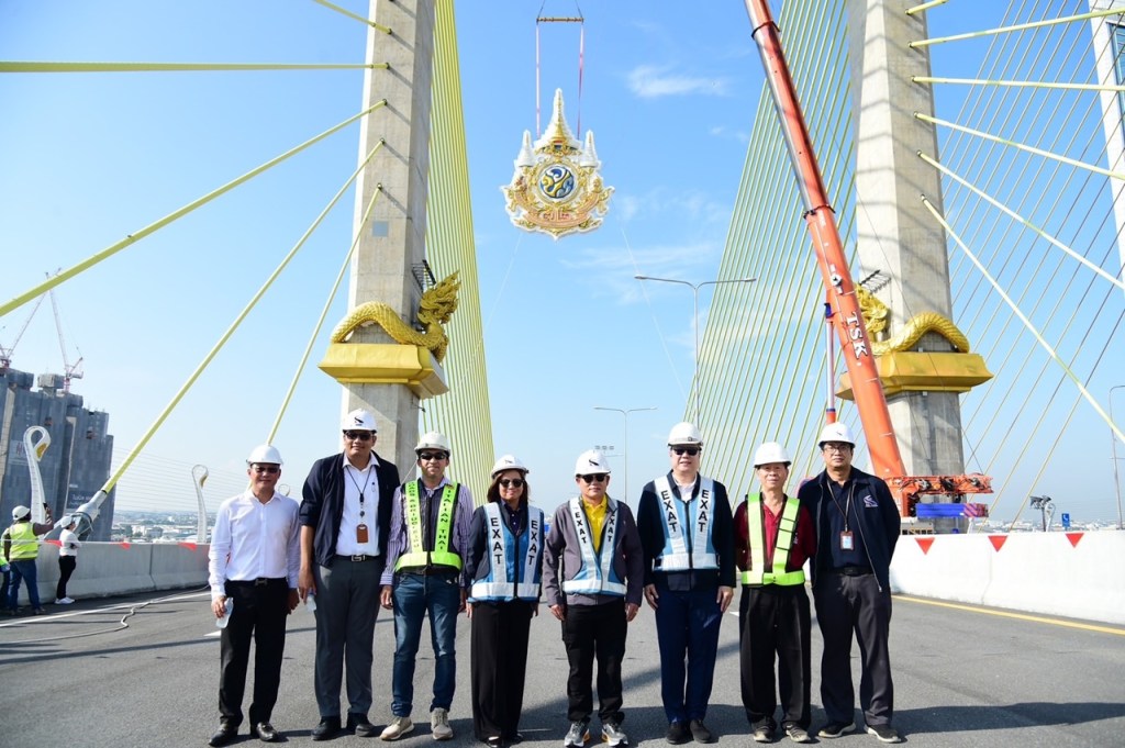 2. ตราสัญลักษณ์ฯ จำนวน 4 ตรา ติดตั้งบริเวณ Upper Crossbeam ของเสา (Pylon) ซึ่งมีความสูงจากระดับผิวถนนบนสะพานทศมราชัน ประมาณ 52 เมตร โดยมีตำแหน่งติดตั้ง 4 ตำแหน่ง คือฝั่งกรุงเทพมหานคร – ขาเข้า ฝั่งกรุงเทพมหานคร-ขาออก ฝั่งธนบุรี – ขาเข้า ปัจจุบันได้ดำเนินการติดตั้งเสร็จเรียบร้อยแล้ว และตำแหน่งสุดท้าย ฝั่งธนบุรี-ขาออก ได้ดำเนินการติดตั้งแล้วเสร็จสมบูรณ์ในวันนี้ (24 ตุลาคม 2567)