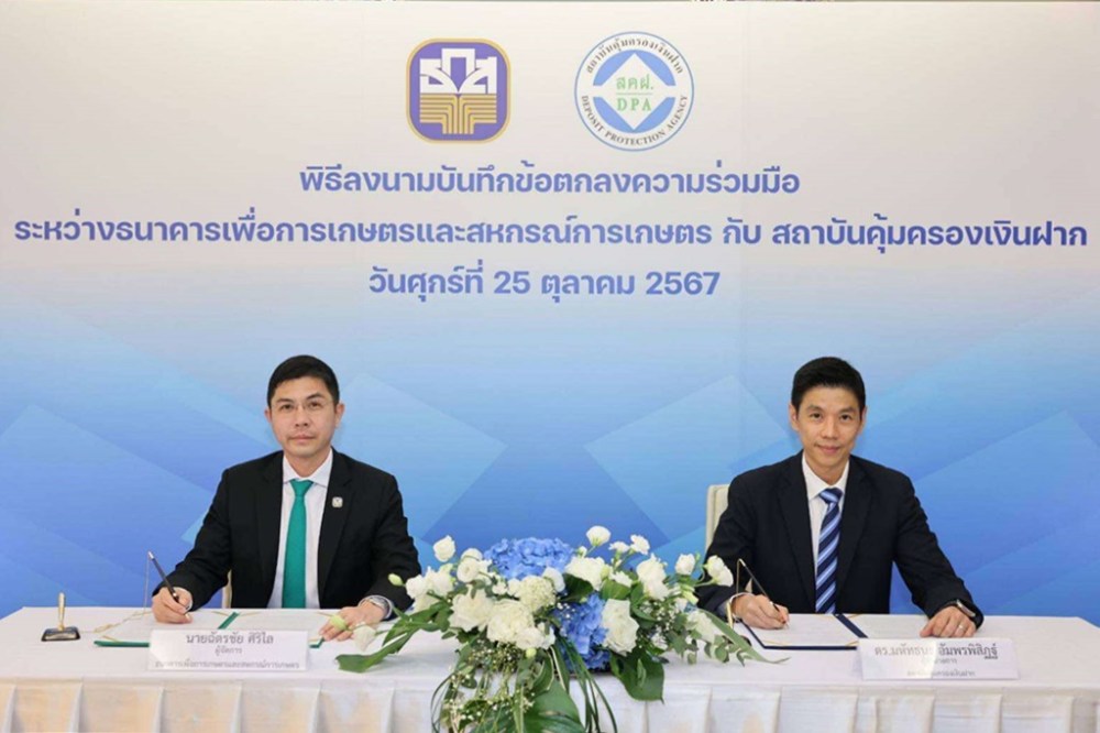 นายฉัตรชัย ศิริไล ผู้จัดการธนาคารเพื่อการเกษตรและสหกรณ์การเกษตร (ธ.ก.ส.) และ ดร. มหัทธนะ อัมพรพิสิฏฐ์ ผู้อำนวยการสถาบันคุ้มครองเงินฝาก (สคฝ.) ร่วมลงนามบันทึกข้อตกลงความร่วมมือสนับสนุนการให้ความรู้เกี่ยวกับการคุ้มครองเงินฝากแก่ประชาชนและการเตรียมความพร้อมในการจ่ายเงินฝากให้แก่ผู้ฝาก ระหว่าง ธ.ก.ส. และ สถาบันคุ้มครองเงินฝาก เพื่อยกระดับความรู้ด้านการคุ้มครองเงินฝากให้กับกลุ่มเป้าหมายได้แก่ ลูกค้าธนาคาร เกษตรกร และประชาชน