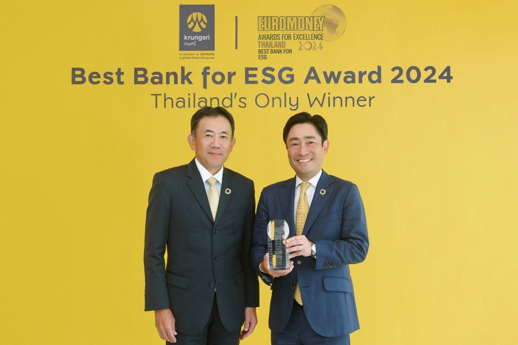 กรุงเทพฯ (25 ตุลาคม 2567) – ธนาคารกรุงศรีอยุธยา จำกัด (มหาชน) นำโดย นายโนริอากิ โกโตะ (ซ้าย) ประธานกรรมการ และ นายเคนอิจิ ยามาโตะ (ขวา) กรรมการผู้จัดการใหญ่และประธานเจ้าหน้าที่บริหาร ฉลองความสำเร็จคว้ารางวัลยอดเยี่ยมด้าน ESG ในประเทศไทย (Thailand’s Best Bank for ESG) โดยเป็นรางวัลที่มอบเป็นครั้งแรกในงานEuromoney’s Awards for Excellence 2024 จัดโดยนิตยสาร Euromoney ซึ่งเป็นหนึ่งในนิตยสารที่ทรงอิทธิพลระดับโลก ส่งผลให้กรุงศรียืนหนึ่งเป็นธนาคารแห่งแรกและแห่งเดียวในประเทศไทยที่ได้รับรางวัลอันทรงเกียรตินี้ ตอกย้ำปณิธานของกรุงศรีในการเป็นธนาคารพาณิชย์ที่ยั่งยืนที่สุดในประเทศไทย
