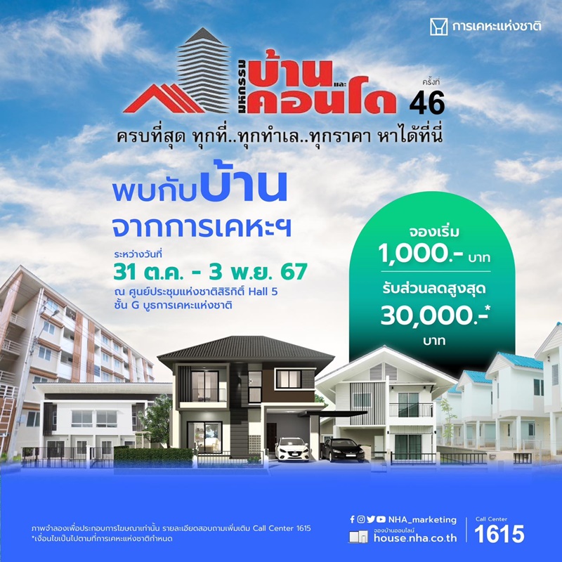 สำหรับผู้ที่สนใจอยากมีบ้านเป็นของตนเอง พบกันได้ที่งาน “มหกรรมบ้านและคอนโด ครั้งที่ 46” ระหว่างวันที่ 31 ตุลาคม ถึงวันที่ 3 พฤศจิกายน 2567 ณ ศูนย์การประชุมแห่งชาติสิริกิติ์ หรือสอบถามรายละเอียดเพิ่มเติมได้ที่เฟซบุ๊กแฟนเพจ : การเคหะแห่งชาติ เฟซบุ๊กแฟนเพจ : NHA Marketing หรือ Call Center 1615