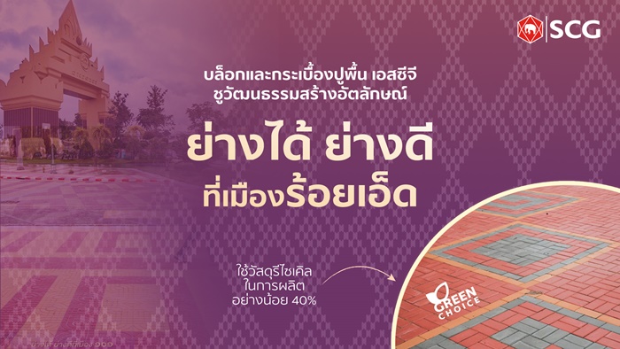 เอสซีจี สมาร์ทลีฟวิง รุกนวัตกรรมวัสดุตกแต่งภูมิทัศน์ ร่วมสร้าง จ.ร้อยเอ็ด แลนด์มาร์คภาคอีสาน ด้วยการออกแบบชูวัฒนธรรมสร้างอัตลักษณ์ เลือกใช้บล็อกและกระเบื้องปูพื้นที่เป็นมิตรกับสิ่งแวดล้อม ใช้วัสดุรีไซเคิลในการผลิตร้อยละ 40 ได้รับรอง SCG Green Choice และคาร์บอนฟุตพริ้นท์ผลิตภัณฑ์จากองค์การบริหารจัดการก๊าซเรือนกระจกแห่งประเทศไทย อาทิ บล็อกปูพื้น กระเบื้องปูพื้นเอสซีจี รุ่น Pavement, Serena และกระเบื้องปูพื้นเอสซีจีเทคโนโลยีใหม่ รุ่น UVT เป็นต้น ทั้งยังผลักดันสินค้าสำเร็จรูป และระบบติดตั้ง ตอบโจทย์ก่อสร้างรวดเร็ว เพื่อแก้ปัญหาให้ลูกค้าที่ต้องการซ่อมแซมบ้านหลังน้ำท่วม อาทิ ไม้เชิงชายรุ่นพร้อม ไม้ฝาและไม้ตกแต่งทำสีสำเร็จ และวัสดุต่อเติมที่ทำงานง่าย ทนน้ำทนชื้น อย่างแผ่นสมาร์ทบอร์ด เอสซีจี เป็นต้น
