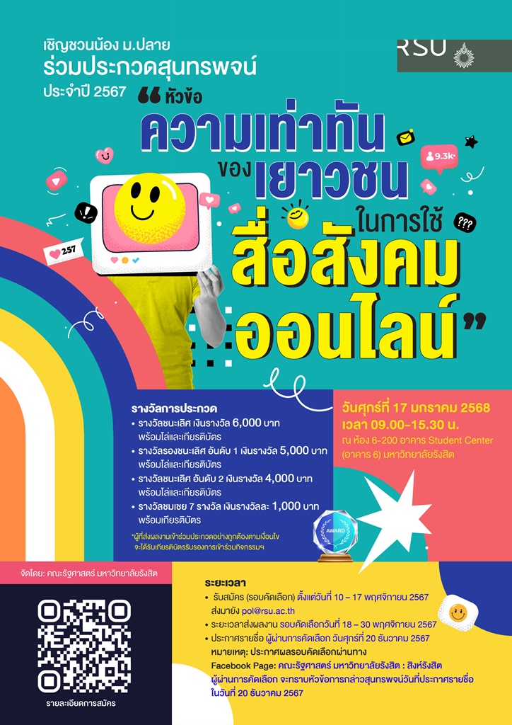 คณะรัฐศาสตร์ มหาวิทยาลัยรังสิต ขอเชิญชวนน้อง ม.ปลาย ร่วมประกวดสุนทรพจน์ ประจำปี 2567หัวข้อ “ความเท่าทันของเยาวชนในการใช้สื่อสังคมออนไลน์” ชิงเงินรางวัลพร้อมโล่และเกียรติบัตร โดยรอบชิงชนะเลิศจะจัดขึ้นในวันศุกร์ที่ 17 มกราคม 2568 เวลา 09.00-15.30 น. ณ ห้อง 6-200 (ชั้น 2) อาคาร Student Center มหาวิทยาลัยรังสิต
