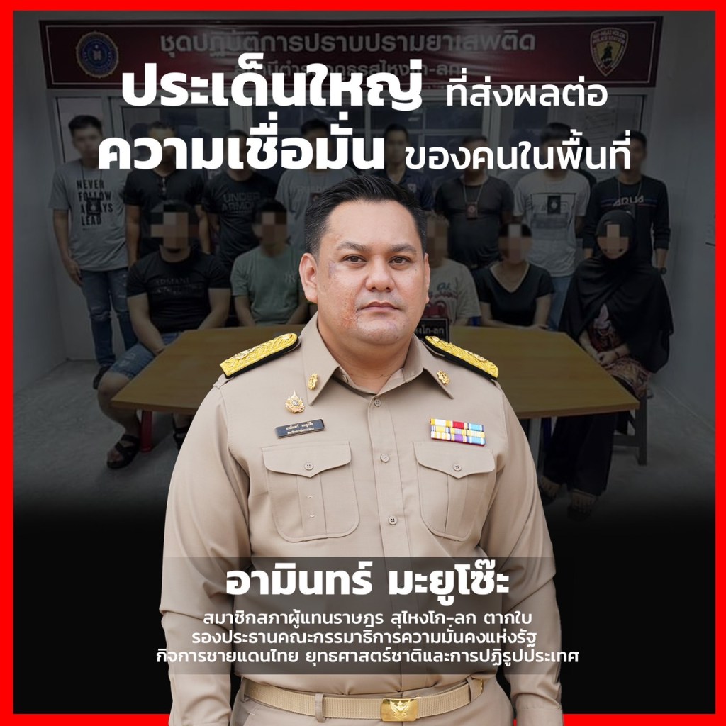 5 พ.ย. 2567 นายอามินทร์ มะยูโซ๊ะ สส.นราธิวาส เขต 2 กล่าวถึง เหตุการณ์การจับกุมนักร้องชื่อดังชาวมาเลเซีย “อีดา อัซลิน” เจ้าของเพลง “แบซอบา แบ ” และเพื่อนชาย-หญิง 5 คนโดยมียาเสพติดไว้ในครอบครอง เป็นจำนวนมาก ในพื้นอำเภอสุไหงโกลก จังหวัดนราธิวาส ที่ซึ่งอาจส่งผลกระทบต่อความสัมพันธ์ระหว่างประเทศ ตนในฐานะ สส.จังหวัดนราธิวาส เขต 2 และรองประธานคณะกรรมาธิการความมั่นคงแห่งรัฐ กิจการชายแดนไทย ยุทธศาสตร์ชาติและการปฏิรูปประเทศ สภาผู้แทนราษฎร มีความเป็นห่วงอย่างมากต่อเหตุการณ์ที่เกิดขึ้นในครั้งนี้