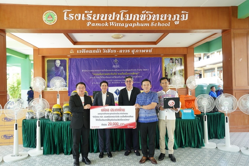 นอกจากนี้ นายสุวิรัช พงศ์เสาวภาคย์ ผู้อำนวยการฝ่ายกิจการภายนอก เป็นผู้แทนเอไอเอ ประเทศไทย ร่วมกับ นางสาววสุมดี วสีนนท์ รองเลขาธิการ ด้านกำกับคนกลางและประกันภัยภูมิภาค และนายสุรินทร์ ตนะศุภผล ผู้ช่วยเลขาธิการ สายกลยุทธ์องค์กร สำนักงาน คปภ. มอบทุนการศึกษาจำนวน 20,000 บาท และแล็ปท็อป 10 เครื่อง โดยมี นายชัยวัฒน์ มั่นอก ผู้อำนวยการโรงเรียนปาโมกข์วิทยาภูมิ และนายอิทธิพล ศรีชัย รักษาการผู้อำนวยการโรงเรียนชุมชนเทศบาลวัดปาโมกข์ (นรสีห์วิทยาคาร) เป็นผู้รับมอบ ผ่านกิจกรรม “สำนักงาน คปภ. รวมพลังภาคประกันภัย รวมใจเพื่อการศึกษาให้กับโรงเรียนภายใต้อุปถัมภ์ของวัดป่าโมกวรวิหาร” เพื่อส่งเสริมด้านการศึกษาแก่เด็กนักเรียนของโรงเรียนในพระอุปถัมภ์ของวัดป่าโมกวรวิหารทั้ง 2 โรงเรียน ซึ่งถือเป็นการตอกย้ำพันธกิจที่เอไอเอมุ่งมั่นอย่างยิ่งในการสนับสนุนให้คนไทยและเยาวชนมีสุขภาพและชีวิตที่ดีขึ้น ตามคำมั่นสัญญา ‘Healthier, Longer, Better Lives’