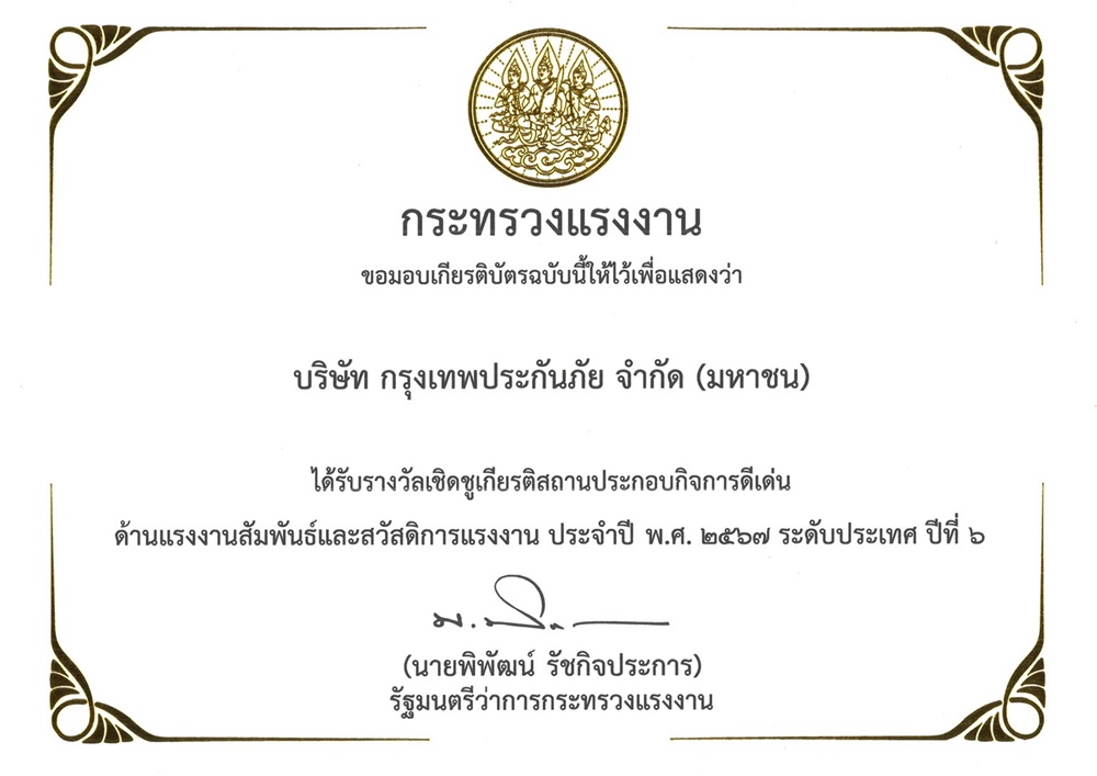 บริษัท กรุงเทพประกันภัย จำกัด (มหาชน) ได้รับรางวัลเชิดชูเกียรติสถานประกอบกิจการดีเด่น ด้านแรงงานสัมพันธ์และสวัสดิการแรงงาน ประจำปี 2567 ระดับประเทศ ปีที่ 6 ประเภทไม่มีสหภาพแรงงาน กลุ่มสถานประกอบกิจการขนาดใหญ่ จัดโดยกรมสวัสดิการและคุ้มครองแรงงาน กระทรวงแรงงาน จากการที่บริษัทฯ มีการบริหารจัดการด้านแรงงานสัมพันธ์และสวัสดิการที่มีมาตรฐานและเหมาะสม และมีการสร้างบรรยากาศการทำงานที่ส่งเสริมให้พนักงานมีคุณภาพชีวิตที่ดี มีความมั่นคงและปลอดภัย รวมถึงพัฒนาศักยภาพบุคลากรเพื่อนำไปสู่การทำงานที่มีประสิทธิภาพ สามารถให้บริการที่ตอบสนองความต้องการของลูกค้าให้ได้รับความพึงพอใจ และสร้างความเติบโตให้แก่องค์กรอย่างยั่งยืน