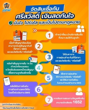 7. บริการหลังการขาย ในกรณีที่มีข้อสงสัยเกี่ยวกับการชำระหนี้หรือต้องการข้อมูลเพิ่มเติม สามารถติดต่อเจ้าหน้าที่ศรีสวัสดิ์ได้ทุกวันผ่านสายด่วน 1652 หรือ LINE Official @srisawad