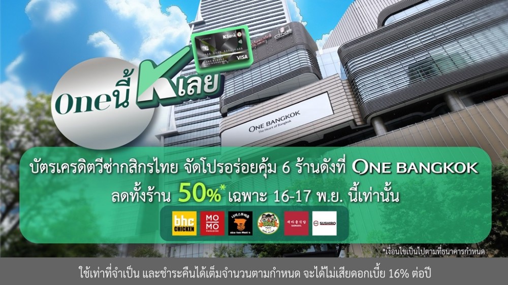 บัตรเครดิตวีซ่ากสิกรไทย ต่อยอดแคมเปญ ““มื้อ นี้ K เลย” แบบเอ็กซ์คลูซีฟ ที่ One Bangkok จัดโปรแรงอร่อยคุ้มลดทั้งร้าน 50%* (สูงสุด 500 บาท) กับ 6 ร้านอาหารชื่อดังที่ One Bangkok ได้แก่ โอ้กะจู๋, BHC Chicken, Momo Paradise, Nice two Meat U, Saemaeul, Sushiro รับสิทธิ์สุดคุ้มในวันที่ 16-17 พ.ย.นี้ ได้ง่ายๆ เพียงแสดงบัตรเครดิตวีซ่ากสิกรไทย พร้อมบัตรประชาชน ณ จุดลงทะเบียนร้านอาหารที่ร่วมรายการ ตั้งแต่เวลา 12.00 น. สำหรับผู้ที่ลงทะเบียนก่อนจำนวน 30 สิทธิ์ ต่อร้าน ต่อวัน
