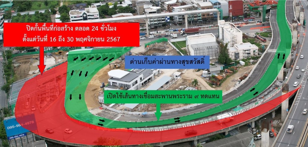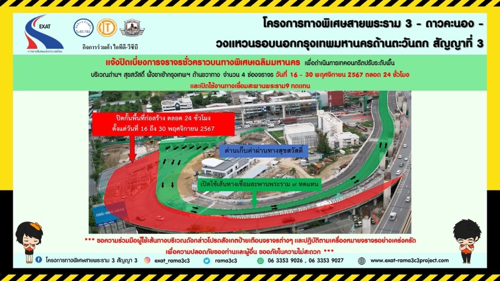 การทางพิเศษแห่งประเทศไทย (กทพ.) กระทรวงคมนาคมได้ว่าจ้าง กิจการร่วมค้า ไอทีดี-วีซีบี (ITD-VCB Joint Venture) ประกอบด้วย บริษัท อิตาเลียนไทย ดีเวล๊อปเมนต์ จำกัด (มหาชน) และบริษัท วิจิตรภัณฑ์ก่อสร้าง จำกัด เป็นผู้รับจ้างดําเนินการก่อสร้าง โครงการทางพิเศษสายพระราม3 – ดาวคะนอง – วงแหวนรอบนอกกรุงเทพมหานครด้านตะวันตกสัญญาที่ 3 แจ้งการปิดจราจรชั่วคราวบนทางพิเศษเฉลิมมหานคร บริเวณด่านฯ สุขสวัสดิ์ ฝั่งขาเข้ากรุงเทพฯ ด้านขวาทางจำนวน 4 ช่องจราจร ตั้งแต่วันที่ 16-30 พฤศจิกายน 2567 ตลอด 24 ชั่วโมง และเปิดใช้งานทางเชื่อมสะพานพระราม 9 ทดแทน