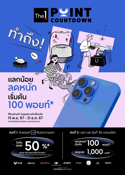 กรุงเทพฯ – เซ็นทรัลพัฒนา ตระหนักถึงพฤติกรรมและความต้องการของนักช้อปยุคใหม่ที่ให้ความสำคัญกับความคุ้มค่าและสิทธิประโยชน์ เปิดตัวแคมเปญ “The 1 Point Countdown แลกน้อย ลดหนัก เริ่มต้นเพียง 100 พอยท์ กับกว่า 1,000 แบรนด์ดังที่ศูนย์การค้าเซ็นทรัลทั่วประเทศ” ตั้งแต่วันที่ 15 พฤศจิกายน ถึง 31 ธันวาคม 2567 มอบสิทธิพิเศษให้สมาชิกได้ใช้พอยท์ ไม่ใช่เพียงแค่รับส่วนลด แต่ยังช่วยสร้างความผูกพันระยะยาวกับลูกค้า เสริมความแข็งแกร่งให้ Brand Loyalty และกระตุ้นให้ลูกค้ากลับมาซื้อสินค้าและบริการซ้ำอย่างต่อเนื่อง แคมเปญนี้จึงเป็นโอกาสให้ลูกค้านำพอยท์มาใช้ให้เกิดความคุ้มค่าสูงสุด ไม่ใช่เพียงการลด แลก แจก แถม แต่เป็นการสร้าง Engagement ที่ทำให้ลูกค้ารู้สึกเป็นส่วนหนึ่งของแบรนด์และอยากกลับมาช้อปซ้ำอย่างต่อเนื่อง โดยปัจจุบันมีร้านค้ากว่า 1,000 แบรนด์ทั่วประเทศที่สามารถสะสมและแลกพอยท์ The 1 ได้ที่ศูนย์การค้าเซ็นทรัล