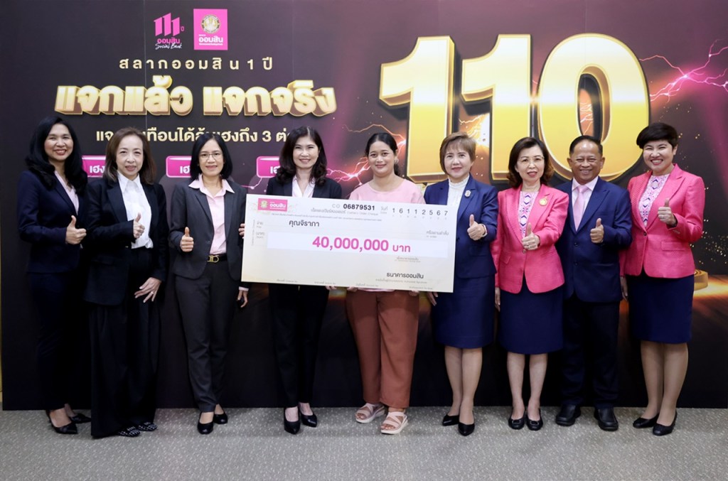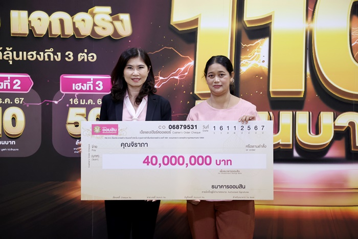 นางสาวศิริพร เลิศสัตยสุกใส รองผู้อำนวยการธนาคารออมสิน กลุ่มลูกค้าบุคคล มอบรางวัลพิเศษ 40 ล้านบาท ให้แก่ คุณจิราภา ลูกค้าธนาคารออมสิน สาขาท่าชนะ จังหวัดสุราษฎร์ธานี โดยเป็นผู้โชคดีจากการถูกรางวัลสลากออมสินพิเศษ 1 ปี งวดที่ 607 หมวดอักษร ศ หมายเลขสลาก 3552973 จากแคมเปญแจกสะเทือนได้ลุ้นเฮงถึง 3 ต่อ มูลค่ารวม 110 ล้านบาท ซึ่งมีการออกรางวัลเฮงที่ 1 ไปเมื่อวันที่ 16 พฤศจิกายน 2567 ที่ผ่านมา โดยมีผู้บริหารร่วมเป็นสักขีพยาน ณ ธนาคารออมสินสำนักงานใหญ่ เมื่อวันที่ 19 พฤศจิกายน 2567 สำหรับสลากออมสินพิเศษ 1 ปี หน่วยละ 100 บาท ไม่จำกัดวงเงินรับฝากสูงสุด เมื่อฝากครบกำหนด 1 ปี จะได้รับเงินต้นพร้อมดอกเบี้ยหน่วยละ 0.25 บาท นอกจากจะมีสิทธิ์ลุ้นรางวัลที่ 1 มูลค่า 10 ล้านบาท และรางวัลอื่น ๆ รวม 12 ครั้ง ยังมีสิทธิ์ลุ้นรางวัลพิเศษ มูลค่า 40 ล้านบาท อีก 1 งวด คือ งวดประจำวันที่ 16 มกราคม 2568 ผู้สนใจสามารถฝากสลากออมสินได้ที่ธนาคารออมสินทุกสาขาทั่วประเทศ และแอป MyMo