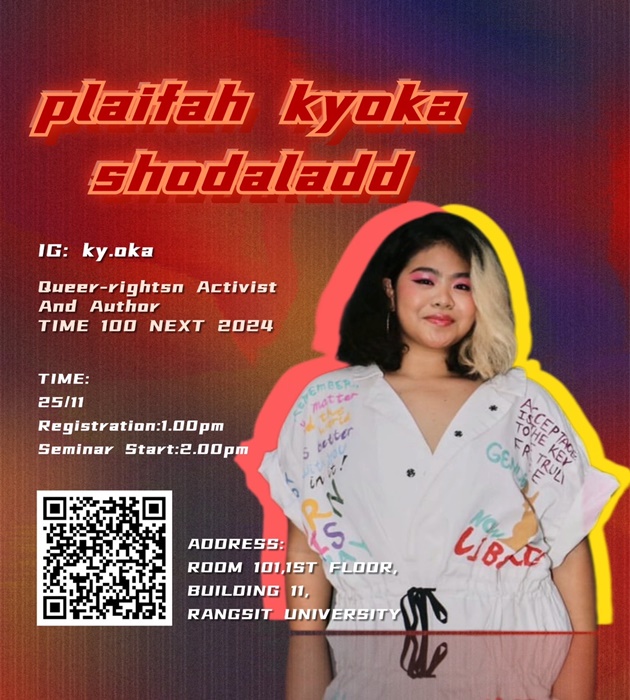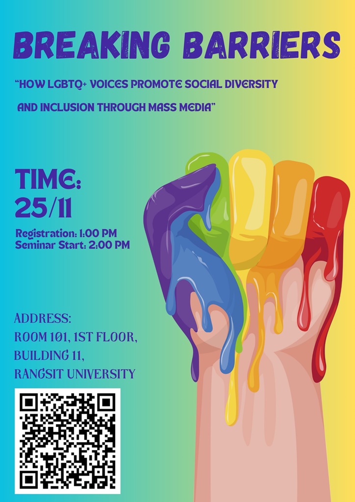 สาขาวิชานิเทศศาสตร์ วิทยาลัยนานาชาติ มหาวิทยาลัยรังสิต จัดสัมมนาวิชาชีพด้านนิเทศศาสตร์ หัวข้อ “Breaking Barriers: How LGBTQ+ Voices Promote Diversity and Inclusion Through Media” ในวันจันทร์ที่ 25 พฤศจิกายน 2567 เวลา 13.00 น. เป็นต้นไป ณ ห้องออดิทอเรียม 11-101 อาคารรัตนคุณากร (อาคาร 11) มหาวิทยาลัยรังสิต