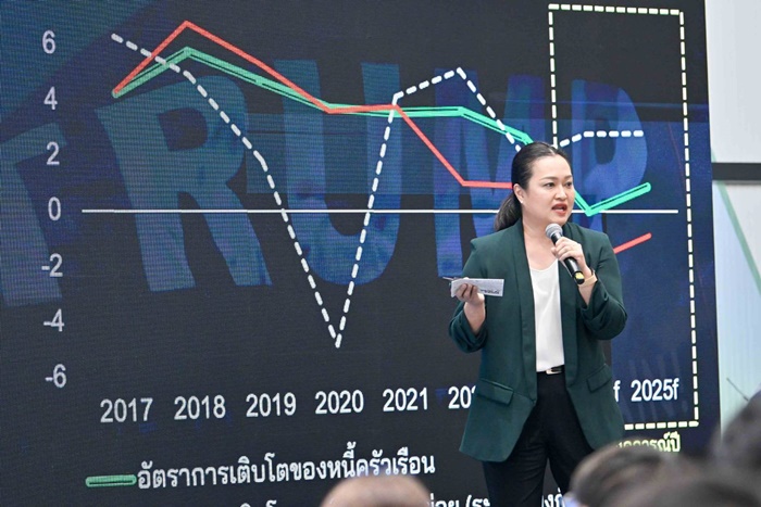 นางสาวณัฐพร ตรีรัตน์ศิริกุล รองกรรมการผู้จัดการ บริษัท ศูนย์วิจัยกสิกรไทย จำกัด ขยายความว่าในปี 2568 เศรษฐกิจไทยคาดว่าจะเติบโตที่ 2.4% ช้าลงกว่าปี 2567 เล็กน้อยที่คาดว่าจะขยายตัว 2.6% จากแรงส่งจากการท่องเที่ยวที่ลดลงตามจำนวนนักท่องเที่ยวที่เข้าใกล้ระดับก่อนโควิด เช่นกันกับส่งออกที่คาดว่าจะโตช้าลงจากผลกระทบสงครามการค้า ทั้งทางตรงผ่านตลาดส่งออกสหรัฐฯ และทางอ้อมผ่านตลาดอื่นๆ ที่ต้องแข่งขันกับสินค้าจีน อย่างไรก็ตาม การลงทุนภาครัฐขยายตัวดีกว่าปีที่ผ่านมาจากเม็ดเงินเบิกจ่ายงบประมาณที่ต่อเนื่อง ในขณะที่การลงทุนเอกชนปรับตัวดีขึ้นจากปี 2567 ที่หดตัว สอดคล้องไปกับ FDIs ที่เข้ามาในอุตสาหกรรมยานยนต์และอิเล็กทรอนิกส์ ทั้งนี้ ความเสี่ยงต่อเศรษฐกิจไทยยังสูง จากความแน่นอนของสงครามการค้า เศรษฐกิจหลักของโลกชะลอตัวลงโดยเฉพาะจีน และภาคการผลิตของไทยที่เจอภาวะการแข่งขันสูงจากสินค้าจีนท่ามกลางขีดความสามารถที่ลดลง