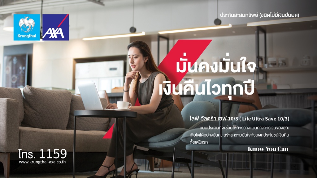 บริษัท กรุงไทย-แอกซ่า ประกันชีวิต จำกัด (มหาชน) ตอกย้ำจุดยืนการผู้นำธุรกิจประกันชีวิตและสุขภาพ เปิดตัวผลิตภัณฑ์ใหม่ “ไลฟ์ อัลตร้า เซฟ 10/3” มุ่งเน้นการสนับสนุนให้ทุกคนได้วางแผนทางการเงินที่เติบโตอย่างมั่นคง สร้างความมั่นใจด้วยผลประโยชน์เงินคืนที่มั่นคงตั้งแต่ปีแรก บริหารง่าย ไม่ยุ่งยาก และไม่ซับซ้อน เพื่อกระจายการลงทุนในยุคที่เศรษฐกิจผันผวน และเพื่อสิทธิในการลดหย่อนภาษี