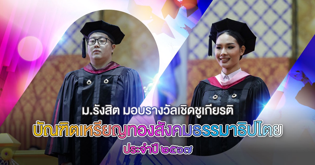 มหาวิทยาลัยรังสิต มอบรางวัลเชิดชูเกียรติบัณฑิตเหรียญทองสังคมธรรมาธิปไตย ประจำปี ๒๕๖๗ แก่บัณฑิตที่ทำกิจกรรมเพื่อส่วนรวม เป็นผู้ที่มีความดี ความงาม มีเป้าหมายเพื่อชีวิตที่ดีงาม พร้อมเป็นพลเมืองที่ดีตามแนวทางแห่งสังคมธรรมาธิปไตย ได้แก่ ศาสตรพล สมใจ บัณฑิตวิทยาลัยวิศวกรรมชีวการเเพทย์ และ อดิเรก เรือนปิน บัณฑิตวิทยาลัยศิลปศาสตร์ ในพิธีประสาทปริญญา ประจำปี ๒๕๖๗