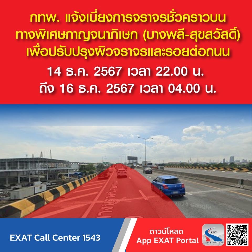 การทางพิเศษแห่งประเทศไทย (กทพ.) กระทรวงคมนาคม ได้ว่าจ้าง บริษัท ไทยวัฒน์วิศวการทาง จํากัด เป็นผู้รับจ้างดําเนินงานปรับปรุงผิวจราจรและรอยต่อทางพิเศษกาญจนาภิเษก (บางพลี – สุขสวัสดิ์) ช่วง กม.9+000 ถึง กม.19+800 และช่วง กม. 20+825 ถึง กม. 22+450 ทิศทางบางพลี – สุขสวัสดิ์ โดยผู้รับจ้าง จะเข้าดำเนินการปรับปรุงผิวจราจรและรอยต่อทางพิเศษกาญจนาภิเษก (บางพลี – สุขสวัสดิ์) บริเวณช่วง กม. ที่ 18+100A ถึง กม.ที่ 18+200A ทิศทาง บางพลี – สุขสวัสดิ์ ช่องจราจรด้านซ้ายและช่องจราจรกลาง จึงมีความจำเป็นจะต้องเบี่ยงการจราจรชั่วคราวบริเวณดังกล่าว ตั้งแต่วันที่ 14 ธ.ค. 2567 เวลา 22.00 น. ถึงวันที่ 16 ธ.ค. 2567 เวลา 04.00 น.