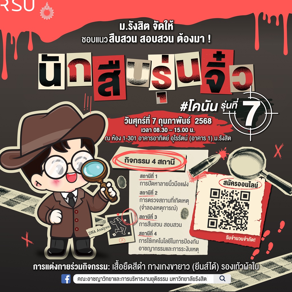 คณะอาชญาวิทยาและการบริหารงานยุติธรรม มหาวิทยาลัยรังสิต เชิญชวนน้องมัธยมศึกษาตอนปลายที่ชอบแนวสืบสวน สอบสวน ร่วมกิจกรรมแคมป์นักสืบรุ่นจิ๋ว #โคนันรุ่น7 โดยกิจกรรมภายในแคมป์น้อง ๆ จะได้เรียนรู้จากสถานีต่าง ๆ ดังนี้ สถานีที่ 1 การปัดหาลายนิ้วมือแฝง สถานีที่ 2 การตรวจสถานที่เกิดเหตุ (จำลองเหตุการณ์) สถานีที่ 3 การสืบสวน สอบสวน และสถานีที่ 4 การใช้เทคโนโลยีในการป้องกันอาชญากรรมและการระงับเหตุ จัดขึ้นในวันศุกร์ที่ 7 กุมภาพันธ์ 2568 เวลา 08.30 – 15.00 น. ณ ห้อง 1-301 อาคารอาทิตย์ อุไรรัตน์ (อาคาร 1) มหาวิทยาลัยรังสิต