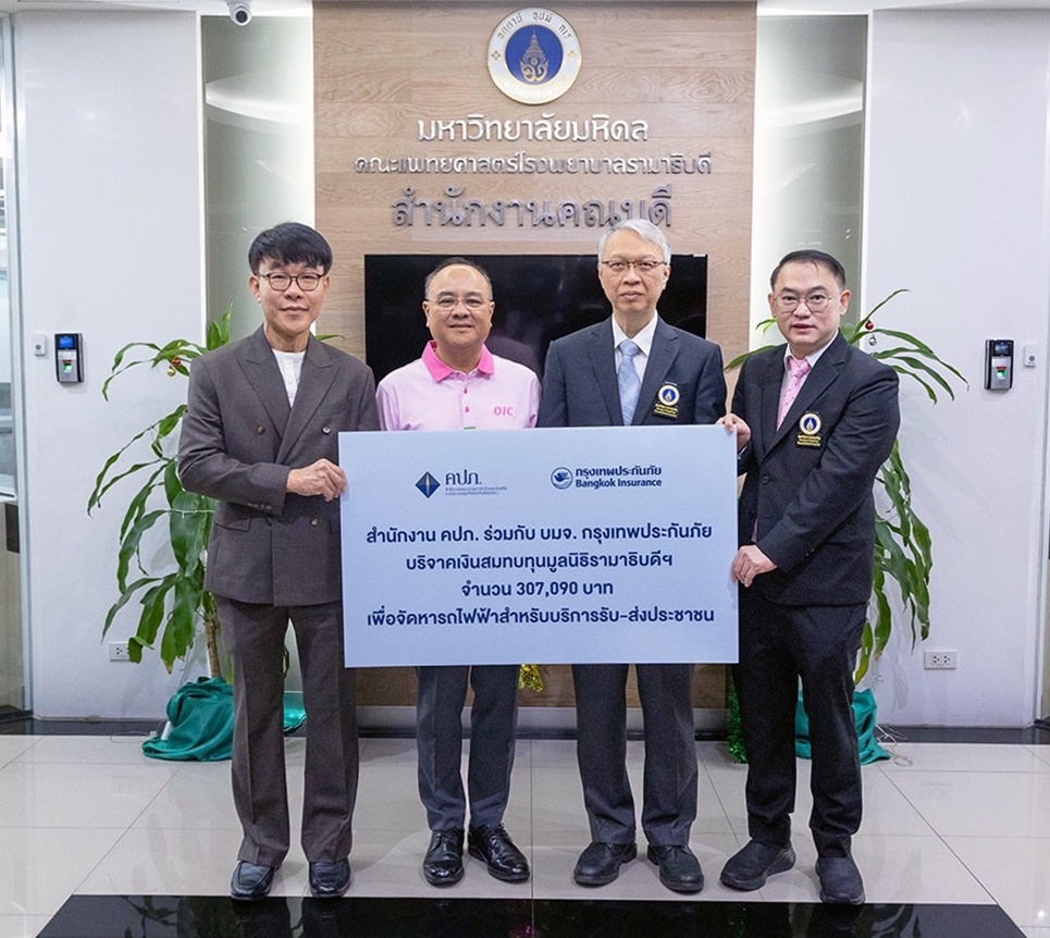 บริษัท กรุงเทพประกันภัย จำกัด (มหาชน) ร่วมกับสำนักงานคณะกรรมการกำกับและส่งเสริมการประกอบธุรกิจประกันภัย (คปภ.) มอบเงินสมทบทุนให้แก่มูลนิธิรามาธิบดี คณะแพทยศาสตร์โรงพยาบาลรามาธิบดี โดยมีดร.อภิสิทธิ์ อนันตนาถรัตน (ซ้ายสุด) ประธานคณะผู้บริหารและกรรมการผู้อำนวยการใหญ่ เป็นผู้แทนบริษัทฯ มอบเงินจำนวน 307,090 บาท และนายชูฉัตร ประมูลผล (ที่ 2 จากซ้าย) เลขาธิการ คปภ. ร่วมมอบและเป็นสักขีพยาน เพื่อจัดหารถไฟฟ้า 6 ที่นั่ง สำหรับให้บริการอำนวยความสะดวกแก่ผู้ป่วย ผู้สูงอายุ และประชาชนผู้ที่มาใช้บริการโรงพยาบาลรามาธิบดี โดยมีศ.คลินิก นพ.อาทิตย์ อังกานนท์ คณบดีคณะแพทยศาสตร์โรงพยาบาลรามาธิบดีและประธานคณะกรรมการบริหารมูลนิธิรามาธิบดีฯ (ที่ 2 จากขวา) และผศ.นพ.ภุชงค์ ลิขิตธนสมบัติ รองคณบดีฝ่ายกายภาพและสิ่งอำนวยความสะดวก (ขวาสุด) เป็นผู้รับมอบ ณ สำนักงานคณบดี คณะแพทยศาสตร์โรงพยาบาลรามาธิบดี มหาวิทยาลัยมหิดล เมื่อวันที่ 13 ธันวาคม 2567