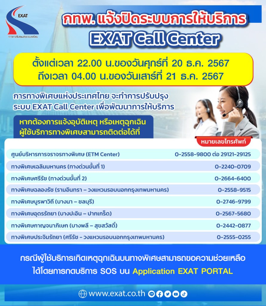 เนื่องด้วยศูนย์บริการข้อมูลผู้ใช้ทางพิเศษ (EXAT Call Center) หมายเลขโทรศัพท์ 1543 การทางพิเศษแห่งประเทศไทย (กทพ.) กระทรวงคมนาคม มีความจำเป็นต้องปิดการให้บริการของระบบโทรศัพท์หมายเลข 1543 ชั่วคราว ตั้งแต่คืนวันศุกร์ที่ 20 ธันวาคม 2567 เวลา 22.00 น. ถึงเวลา 04.00 น. ของวันเสาร์ที่ 21 ธันวาคม 2567 เพื่อดำเนินการย้ายอุปกรณ์แม่ข่ายภายในห้อง External Network Room ซึ่งการปิดระบบโทรศัพท์ ทำให้ผู้ใช้บริการไม่สามารถติดต่อหมายเลข 1543 ได้ในช่วงวันและเวลาดังกล่าว