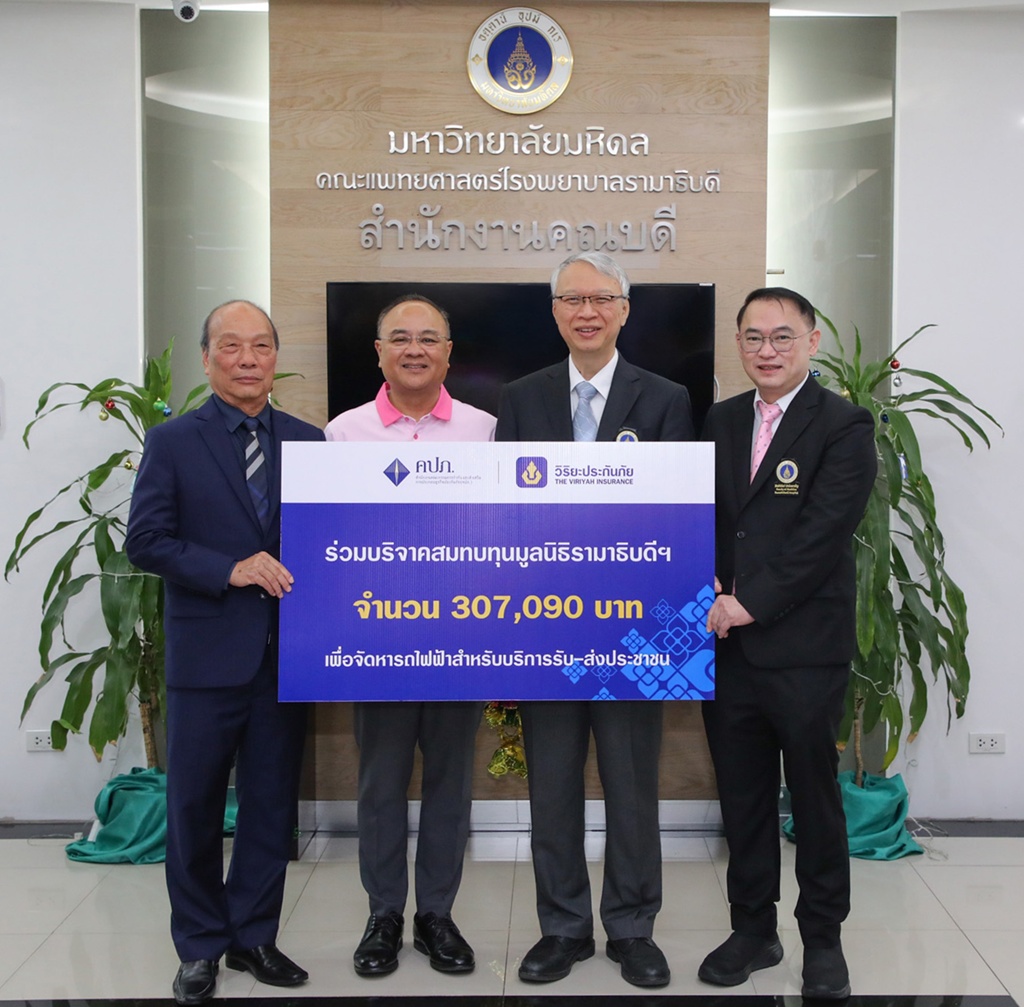 ศาสตราจารย์คลินิก นายแพทย์อาทิตย์ อังกานนท์ คณบดีคณะแพทยศาสตร์โรงพยาบาลรามาธิบดี รับมอบเงินสมทบทุน จำนวน 307,090 บาท จาก บริษัท วิริยะประกันภัย จำกัด (มหาชน) โดยมี นายดลเดช สัจจวีระกุล รองกรรมการผู้จัดการ เป็นผู้แทนมอบ เพื่อสนับสนุนโครงการจัดหารถไฟฟ้าบริการรับ-ส่งประชาชน ภายในโรงพยาบาลรามาธิบดี มหาวิทยาลัยมหิดล ซึ่งจัดขึ้นภายใต้การดำเนินงานของสำนักงานคณะกรรมการกำกับและส่งเสริมการประกอบธุรกิจประกันภัย (คปภ.) และในโอกาสนี้ ได้รับเกียรติจาก นายชูฉัตร ประมูลผล เลขาธิการคณะกรรมการกำกับและส่งเสริมการประกอบธุรกิจประกันภัย ร่วมเป็นประธานสักขีพยาน ณ ห้องรับรอง สำนักงานคณบดีคณะแพทยศาสตร์ อาคารบริหาร ชั้น 5 โรงพยาบาลรามาธิบดี มหาวิทยาลัยมหิดล
