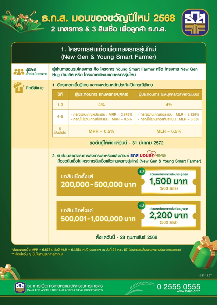 ธ.ก.ส. ส่งต่อความสุขรับปี 2568 มอบของขวัญปีใหม่ให้เกษตรกรลูกค้าตามนโยบายรัฐบาลด้วย2 มาตรการแก้ปัญหาหนี้สินครัวเรือน “ปรับปรุงโครงสร้างหนี้เรื้อรัง” และ “มาตรการจ่าย-ปิด-จบ” พร้อม 3 สินเชื่ออัตราดอกเบี้ยต่ำสนับสนุนทายาทเกษตรกรและเกษตรกรรุ่นใหม่ในการรับช่วงต่อการประกอบอาชีพครอบครัว รวมถึงการต่อยอดและสร้างโอกาสให้กับธุรกิจเกษตรผ่าน “สินเชี่อเพื่อเกษตรกรรุ่นใหม่” และ “สินเชื่อแทนคุณ” พร้อมคืนกำไรให้ลูกค้าที่ชำระหนี้ใกล้กำหนดหรือตรงตามกำหนดด้วย “โครงการชำระดีมีโชค ปี 2567/68”