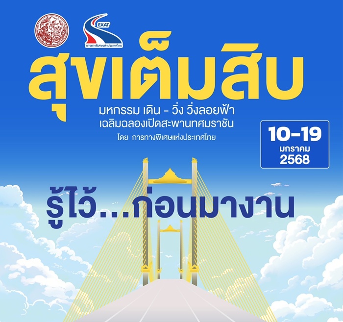 การทางพิเศษแห่งประเทศไทยพร้อมพันธมิตรทั้งภาครัฐและเอกชน ขอเชิญชวนประชาชนเข้าร่วม “มหกรรมสุขเต็มสิบ” งานเฉลิมฉลองเปิดสะพานทศมราชัน ที่จะจัดขึ้นระหว่างวันที่ 10-19 มกราคม 2568 พร้อมเปิดโอกาสให้ประชาชนได้สัมผัสประสบการณ์ชมวิวสุดพิเศษจากสะพานแห่งใหม่ เพื่อความสะดวกและปลอดภัยสำหรับผู้เข้าร่วม “มหกรรมสุขเต็มสิบ” ขอแนะนำ ขั้นตอนสำคัญก่อนขึ้นชมสะพาน