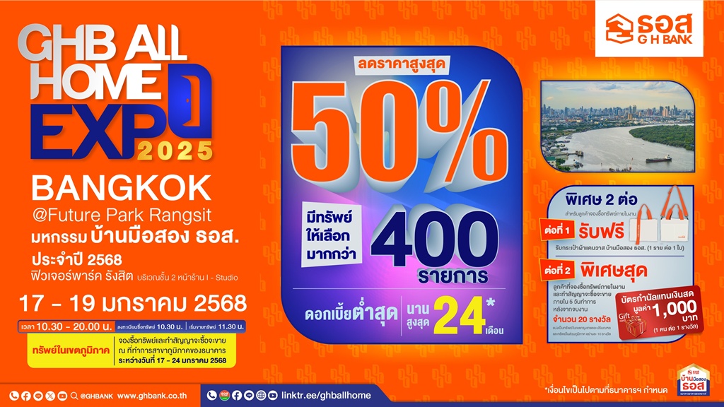 ธนาคารอาคารสงเคราะห์ (ธอส.) จัด “งานมหกรรมบ้านมือสอง GHB ALL HOME EXPO ประจำปี 2568 ครั้งที่ 1” นำทรัพย์เด่น ทำเลดี ราคาสุดคุ้มมากกว่า 400 รายการทั่วประเทศ ลดราคาสูงสุดถึง 50% ระหว่างวันที่ 17 – 19 มกราคม 2568 ตั้งแต่เวลาเปิดทำการศูนย์การค้า ถึง 20.00 น. พิเศษ 2 ต่อ!! ต่อที่ 1 เพียงจองทรัพย์ภายในงานรับฟรีกระเป๋าผ้าแคนวาส 1 ใบ และต่อที่ 2 หากจองและทำสัญญาจะซื้อจะขายภายใน 5 วันทำการหลังจากจบงาน รับบัตรกำนัลแทนเงินสดมูลค่า 1,000 บาท จำนวน 20 รางวัล