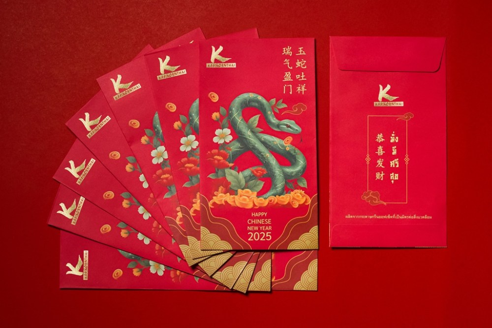 ธนาคารกสิกรไทย ร่วมฉลองตรุษจีน 2568 ปี “งู” จัดทำซองอั่งเปา “มั่ง มี ศรี สุข” รูปงูด้วยลวดลายดอกไม้วิจิตรตระการตาตลอดลำตัว เสริมความมงคลที่น่าหลงใหล ทั้งผู้ให้และผู้รับ เหรียญทองที่กระจายรอบตัวนั้นพุ่งขึ้นมาจากภูเขาไฟมหาสมบัติ ให้เงินซองนี้ เป็นขวัญถุงนำโชค นำทางให้เงินทองพุ่งปงปะทุร้อนแรงตลอด ลักษณะท่าทางการเลื้อย ขดตัวเป็นเลข 8 เพื่อสื่อถึงเลขมงคล ความร่ำรวย ความมีเสน่ห์ไม่รู้จบ ซองผลิตจากกระดาษกรีนออฟเซ็ตที่เป็นมิตรต่อสิ่งแวดล้อม จำนวน 2,200,000 ซอง เพื่อมอบให้แก่ลูกค้าสำหรับใส่ธนบัตรแจกจ่ายในช่วงเทศกาลตรุษจีน สามารถติดต่อรับได้ที่ธนาคารกสิกรไทยทุกสาขาทั่วประเทศ ตั้งแต่วันนี้เป็นต้นไป