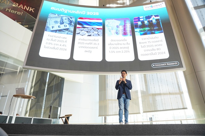 บล. อินโนเวสท์ เอกซ์ เรือธงด้านการลงทุนภายใต้กลุ่มเอสซีบีเอกซ์ (SCBX Group) ประเมินภาพรวมเศรษฐกิจโลกและการลงทุนปี 2568 จะอยู่ในสภาพของ “ความผันผวนสูง ผลตอบแทนต่ำ” กลยุทธ์การลงทุนที่เหมาะคือ “การลงทุนแบบเก็งกำไร (Trading)” เศรษฐกิจโลกจะถูกขับเคลื่อนด้วยแรงสำคัญ 4T ได้แก่ 1. Transition – การเปลี่ยนผ่านจากภาวะเงินเฟ้อสูงมาสู่ภาวะ Soft Landing 2. Trump – การกลับมาของนโยบาย America First 3. Technology – พลังขับเคลื่อนจาก AI และเทคโนโลยีสีเขียว และ 4. Turmoil – ความปั่นป่วนทั่วโลก อันเนื่องมาจากความขัดแย้งระหว่างประเทศ ด้านเศรษฐกิจไทยคาดว่าจะเติบโต 2.7% โดยความท้าทายส่วนใหญ่จะเกิดจากนโยบายของนายโดนัลด์ ทรัมป์ทั้งด้านเศรษฐกิจและต่างประเทศ สินทรัพย์ที่น่าลงทุนคือ ทองคำ ตราสารหนี้คุณภาพดีใน 1H25 ตลาดหุ้นผันผวน เน้นไปที่เชิงรับและหุ้น Value ที่มีการฟื้นตัว แนะนำเลือกลงทุนในตลาดหุ้นสหรัฐฯ จีน อินเดีย และ เวียดนาม ด้านตลาดหุ้นไทยคาดว่ากำไรสุทธิจะเติบโต 22%YoY โดยมองเป้าหมาย SET Index ที่ 1,550 จุด กลุ่มอุตสาหกรรมที่คาดว่าจะให้ผลตอบแทนโดดเด่นจะเป็นกลุ่มมีการสัดส่วนรายได้ภายในประเทศสูงและเป็นกลุ่มเชิงรับ อาทิเช่น กลุ่มอาหารและเครื่องดื่ม และกลุ่มพาณิชย์