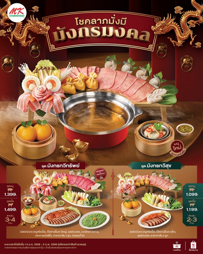ยังไม่จบเพียงเท่านี้ ยังมีความมงคลต่อที่หน้าร้านแบบอลังการ เพื่อสร้างโมเมนต์พิเศษกับครอบครัวในช่วงตรุษจีน ผ่านมื้ออาหารมงคล อิ่มสุขภาพดีกันทั้งบ้าน เฉพาะช่วงเทศกาลตรุษจีนนี้เท่านั้น กับ ‘ชุดสุกี้โชคลาภมั่งมีมังกรมงคล’ เสิร์ฟวัตถุดิบคุณภาพพร้อมความหมายมงคลแบบอลังการบนบัลลังก์มังกรขอขยี้ความอลังการ การตกแต่งสวยงาม วางบนโต๊ะแล้วปัง ความมงคล และ ingredient เพิ่มอีก มีให้เลือกทั้งบัลลังก์มังกรหมูและเนื้อ อีกทั้งยังเป็นการรวมเมนูซิกเนเจอร์ในชุดทั้ง เป็ดย่าง MK, บะหมี่หยก, ชุดผักมงคล และเมนูใหม่ ปลากะพงนึ่งซีอิ๊ว ตบท้ายด้วยซาลาเปาส้มมงคล และบัวลอยน้ำขิง ชุดเริ่มต้นเพียง 1,099 บาท ตั้งแต่วันที่ 14 มกราคม 2568 – 2 กุมภาพันธ์ 2568